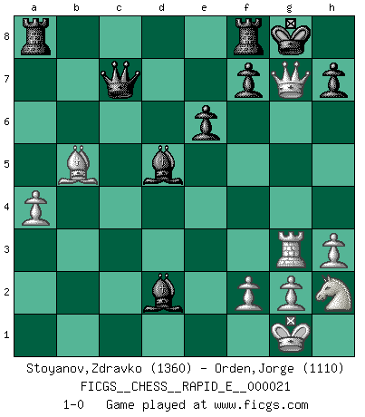Last move : 1-0 2009 November 25 16:3:30 [Event "FICGS__CHESS__RAPID_E__000021"] [Site "FICGS"] [Date "2009.11.05"] [Round "1"] [White "Stoyanov,Zdravko"] [Black "Orden,Jorge"] [Result "1-0"] [WhiteElo "1360"] [BlackElo "1110"] 1.e4 c5 2.Nf3 d6 3.h3 Nf6 4.c3 e6 5.Be2 Be7 6.a3 O-O 7.d3 Nc6 8.O-O a6 9.Be3 b5 10.Re1 Bb7 11.b4 c4 12.dxc4 Nxe4 13.Bd3 Nf6 14.cxb5 axb5 15.Bxb5 Nd5 16.c4 Nxe3 17.Rxe3 Qc7 18.a4 Nxb4 19.Nbd2 d5 20.cxd5 Nc2 21.Rd3 Nxa1 22.Qxa1 Bxd5 23.Nh2 Bb4 24.Rg3 Bxd2 25.Qxg7+ 1-0 Sicilian Kingside Castling by player Black (move 6) Kingside Castling by player White (move 8) Player White won this chess game. Follow this game move after move (download)The mistakes are there, waiting to be made. (Savielly Tartakower) Kein Schachspieler kann gut schlafen. (H. G. Wells) Cuando tengo las piezas blancas, yo gano porque soy blanco; Cuando tengo las piezas negras, yo gano porque soy Bogolyubov. (Bogolyubov) La guerre est enfant de la passion, la passion est enfant du narcissisme et le narcissisme est l'enfant. (...) Une autre partie ? (Thibault de Vassal) They say poker is a zero-sum game. It must be, because every time I play my sum ends up zero. (Max Shapiro)