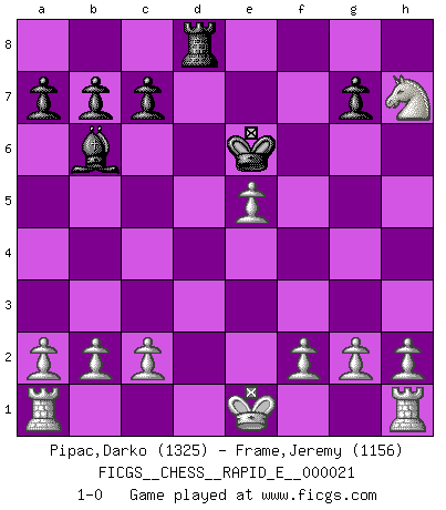 Last move : 1-0 2009 November 22 22:3:15 [Event "FICGS__CHESS__RAPID_E__000021"] [Site "FICGS"] [Date "2009.11.05"] [Round "1"] [White "Pipac,Darko"] [Black "Frame,Jeremy"] [Result "1-0"] [WhiteElo "1325"] [BlackElo "1156"] 1.e4 e5 2.Nf3 Nf6 3.Nxe5 Bc5 4.Bc4 O-O 5.d4 Bb6 6.Bxf7+ Rxf7 7.Nxf7 Kxf7 8.Bg5 d6 9.Nc3 Be6 10.e5 dxe5 11.Qf3 Nbd7 12.Bxf6 Nxf6 13.dxe5 Bd5 14.Nxd5 Qe8 15.Qf5 Rd8 16.Nxf6 Qe6 17.Qxe6+ Kxe6 18.Nxh7 1-0 Petrov's defense Kingside Castling by player Black (move 4) Player White won this chess game. Follow this game move after move (download)The blunders are all there on the board, waiting to be made. (Savielly Tartakover) Es ist besser die Steine des Gegners zu opfern. (Savielly Grigorievitsch Tartakower) Dejen al perfeccionista jugar por correo. (Yasser Seirawan) Seul un grand joueur sait à quel point il joue faiblement. (Xavier Tartacover) It is not titles that honor men, but men that honor titles. (Niccolo Machiavelli)