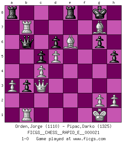 Last move : 1-0 2009 December 3 22:4:2 [Event "FICGS__CHESS__RAPID_E__000021"] [Site "FICGS"] [Date "2009.11.05"] [Round "1"] [White "Orden,Jorge"] [Black "Pipac,Darko"] [Result "1-0"] [WhiteElo "1110"] [BlackElo "1325"] 1.e4 c5 2.Nf3 Nc6 3.d4 d6 4.d5 Ne5 5.Be2 Nf6 6.Nbd2 Nxf3+ 7.Bxf3 Bg4 8.Bxg4 g6 9.c3 Bh6 10.O-O O-O 11.Bh3 Bxd2 12.Bxd2 Nxe4 13.Bh6 Re8 14.f3 Nf6 15.c4 Nd7 16.a3 Ne5 17.b3 a6 18.f4 Nd7 19.f5 Ne5 20.fxg6 fxg6 21.Be6+ Kh8 22.Qd2 Qb6 23.Rab1 a5 24.Qc3 a4 25.Rf7 axb3 26.Bg7+ Kg8 27.Rxe7 Nf7 28.Rxf7 h5 29.Rxb7 1-0 Sicilian defense Kingside Castling by player White (move 10) Kingside Castling by player Black (move 10) Player White won this chess game. Follow this game move after move (download)It is always better to sacrifice your opponent's men. (Savielly Tartakower) Ich erzeugte keinen Neid, da mich die Schachspieler als Musiker und die Musiker als Schachspieler betrachteten. (Mark Taimanov) Realmente no sabemos como el juego fue inventado, aunque hay sospechas. Tan pronto como descubramos a los culpables, se los haremos saber. (Bruce Pandolfini) Lorsque vous vous retrouvez devant une position atroce, ne tendez pas un ultime piège dérisoire avec l'intention d'abandonner si l'adversaire le déjoue ! Faites-vous plutôt un devoir de résister comme si votre vie en dépendait. Jouez le coup qui vous déplairait au centuple si vous étiez dans la peau de votre tortionnaire ! There's always a bigger fish. (Qui-Gon Jinn in Star Wars ep.1)