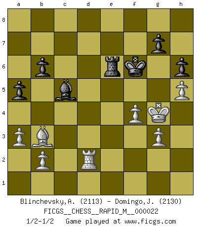 Last move : 1/2-1/2 2010 February 16 16:44:51 [Event "FICGS__CHESS__RAPID_M__000022"] [Site "FICGS"] [Date "2009.11.07"] [Round "1"] [White "Blinchevsky,Alexander"] [Black "Domingo,Jordi"] [Result "1/2-1/2"] [WhiteElo "2113"] [BlackElo "2130"] 1.d4 d5 2.c4 dxc4 3.Nf3 c5 4.d5 e6 5.Nc3 exd5 6.Qxd5 Qxd5 7.Nxd5 Bd6 8.Nd2 Nc6 9.Nxc4 Bb8 10.e4 Nd4 11.Bd3 Ne7 12.Be3 Be6 13.Nxe7 Bxc4 14.Bxd4 cxd4 15.Bxc4 Kxe7 16.Ke2 Bd6 17.Kd3 Rac8 18.Bd5 Rc5 19.Rac1 Rhc8 20.Rxc5 Rxc5 21.h4 f6 22.g3 f5 23.f4 fxe4+ 24.Bxe4 h6 25.Kxd4 Rc7 26.Ke3 Bc5+ 27.Kf3 Rd7 28.Rh2 b6 29.Re2 Kf6 30.Kg4 Re7 31.h5 Re6 32.a3 a5 33.Kf3 Rd6 34.Bc2 Re6 35.Rd2 Re3+ 36.Kg4 Re1 37.Ba4 Re4 38.Bb3 Re3 39.Bd1 Re6 40.Bb3 1/2-1/2 QGA : 3.Nf3 This chess game ended in a draw. Follow this game move after move (download)Daring ideas are like Chess men moved forward. They may be beaten, but they may start a winning game. (Johann Wolfgang von Goethe) Jede Eröffnung ist gut genug um gespielt zu werden, wenn nur ihr Ruf schlecht genug ist. (Savielly Grigorievitsch Tartakower) El Ajedrez es sobre todo, ¡una pelea!. (Emanuel Lasker) Ce n'est pas pour s'amuser qu'il joue aux échecs : il célèbre un culte. (Vladimir Nabokov) Shallow men believe in luck. Strong men belive in cause and effect. (Ralph Waldo Emerson)