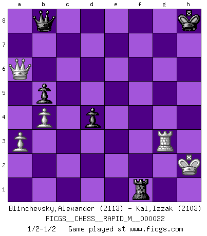 Last move : 1/2-1/2 2010 April 13 20:56:47 [Event "FICGS__CHESS__RAPID_M__000022"] [Site "FICGS"] [Date "2009.11.07"] [Round "1"] [White "Blinchevsky,Alexander"] [Black "Kal,Izzak"] [Result "1/2-1/2"] [WhiteElo "2113"] [BlackElo "2103"] 1.d4 Nf6 2.c4 e6 3.Nf3 d5 4.Nc3 Be7 5.Bg5 O-O 6.e3 Nbd7 7.Qc2 c5 8.cxd5 Nxd5 9.Bxe7 Qxe7 10.Nxd5 exd5 11.Bd3 g6 12.dxc5 Nxc5 13.O-O Bg4 14.Nd4 Rac8 15.Rac1 Rfe8 16.Bb5 Red8 17.h3 Ne4 18.Qd3 Be6 19.Rfd1 a6 20.Ba4 Qf6 21.Qe2 Kg7 22.Bc2 h6 23.Qe1 b6 24.Qe2 b5 25.Qe1 Bd7 26.Bb3 Qe5 27.a3 Re8 28.Ba2 Rf8 29.f4 Qd6 30.Bb1 Rxc1 31.Rxc1 Re8 32.Bxe4 Rxe4 33.Qc3 Kh7 34.Qd2 g5 35.Rf1 Kg7 36.b4 Qe7 37.Rf3 f6 38.Nb3 Rc4 39.Nc5 Bc6 40.Rg3 Kh8 41.h4 gxh4 42.Rg4 Qf7 43.Rxh4 Kh7 44.Rg4 f5 45.Rg3 Qf6 46.Qe1 d4 47.e4 fxe4 48.Nxe4 Qxf4 49.Rg4 Qf8 50.Nd2 Rc2 51.Qe5 Rxd2 52.Qc7+ Kh8 53.Qxc6 h5 54.Rg3 Rd1+ 55.Kh2 Rf1 56.Qxa6 h4 57.Rg4 Qb8+ 58.g3 hxg3+ 59.Rxg3 1/2-1/2 Queen's pawn game Kingside Castling by player Black (move 5) Kingside Castling by player White (move 13) 10 pieces endgame at move 59 : White KQRPP , Black KQRPP WHITE : King + 1 Queen 1 Rook 2 Pawns BLACK : King + 1 Queen 1 Rook 2 Pawns This chess game ended in a draw. Follow this game move after move (download)Chess is like war on a board. (Bobby Fischer) Ich hatte Angst gegen einen russischen Großmeister zu verlieren, und er befürchtete gegen einen kleinen Jungen zu verlieren. (über ein Remis gegen Juri Awerbach). (Robert James Fischer) Debió haber existido una vez en que los hombres eran semidióses, de otra manera no hubiesen podido inventar el Ajedrez. (Gustav Schenk) Des combinaisons [dans le jeu d'échecs] pareilles à des mélodies. Je crois entendre pour ainsi dire la musique des coups... (Vladimir Nabokov) The project of the man are lower than those of the sky. (Chinese proverb)