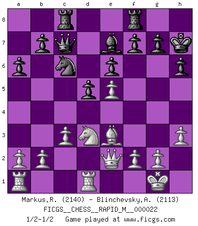 Last move : 1/2-1/2 2010 January 17 14:0:25 [Event "FICGS__CHESS__RAPID_M__000022"] [Site "FICGS"] [Date "2009.11.07"] [Round "1"] [White "Markus,Roland"] [Black "Blinchevsky,Alexander"] [Result "1/2-1/2"] [WhiteElo "2140"] [BlackElo "2113"] 1.e4 c6 2.d4 d5 3.e5 Bf5 4.Nf3 e6 5.Be2 Nd7 6.O-O Ne7 7.c3 h6 8.Na3 Bh7 9.Nc2 Nf5 10.Bd3 Be7 11.Nfe1 c5 12.Ne3 Nxe3 13.Bxe3 O-O 14.Qg4 Kh8 15.Bxh7 Kxh7 16.Nd3 Rc8 17.Rfd1 a6 18.h3 cxd4 19.Bxd4 Qc7 20.Rd2 Nb8 21.Qh5 Nc6 22.Be3 Na5 23.R2d1 Qc4 24.Bd4 Qc7 25.Qe2 Nc6 26.Be3 1/2-1/2 Caro-Kann : Advance variation Kingside Castling by player White (move 6) Kingside Castling by player Black (move 13) This chess game ended in a draw. Follow this game move after move (download)A passed Pawn increases in strength as the number of pieces on the board diminishes. (Capablanca) Ich bin stolz ein Bulgare zu sein. (Veselin Topalov) Vive, pierde y aprende al observar a tu oponente como gana. (Amber Steenbock) Aidez vos pièces, elles vous aideront. (Paul Morphy) Whenever people agree with me, I always feel I must be wrong. (Oscar Wilde)