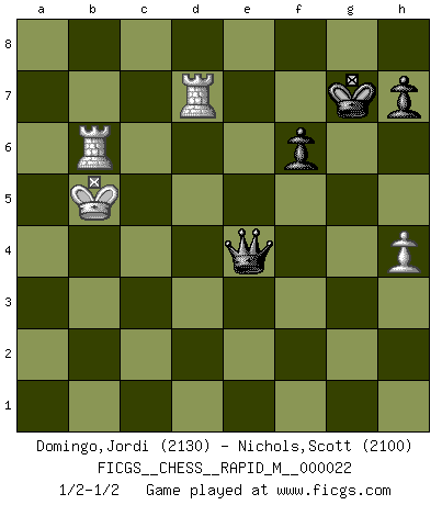 Last move : 1/2-1/2 2010 January 16 16:4:26 [Event "FICGS__CHESS__RAPID_M__000022"] [Site "FICGS"] [Date "2009.11.07"] [Round "1"] [White "Domingo,Jordi"] [Black "Nichols,Scott"] [Result "1/2-1/2"] [WhiteElo "2130"] [BlackElo "2100"] 1.e4 c5 2.Nf3 d6 3.d4 cxd4 4.Nxd4 Nf6 5.Nc3 a6 6.Be3 e5 7.Nb3 Be6 8.f3 Be7 9.Qd2 O-O 10.O-O-O Nbd7 11.g4 b5 12.g5 b4 13.Ne2 Ne8 14.f4 a5 15.f5 a4 16.Nbd4 b3 17.Kb1 exd4 18.Nxd4 bxc2+ 19.Nxc2 Bb3 20.axb3 axb3 21.Na3 Ne5 22.h4 Ra4 23.f6 gxf6 24.Qg2 Kh8 25.Bb5 Rxa3 26.bxa3 Qa8 27.Rd4 Nc7 28.Qe2 d5 29.gxf6 Nxb5 30.Qxb5 Nc4 31.fxe7 Nxa3+ 32.Kb2 Nxb5 33.Ra4 Qb8 34.exf8Q+ Qxf8 35.Rha1 Kg7 36.Ra6 f6 37.Rg1+ Kh8 38.Bc5 Qb8 39.Rb6 Qh2+ 40.Kxb3 d4 41.Rc1 Qf4 42.Rc4 Qg3+ 43.Kb4 d3 44.Be7 d2 45.Rc8+ Kg7 46.Rd8 Qa3+ 47.Kxb5 Qxe7 48.Rxd2 Qxe4 49.Rd7+ 1/2-1/2 Sicilian : Najdorf, Byrne (English) attack Kingside Castling by player Black (move 9) Queenside Castling by player White (move 10) Promotion Queen by player White (move 34) 10 pieces endgame at move 47 : White KRRPP , Black KQPPP WHITE : King + 2 Rooks 2 Pawns BLACK : King + 1 Queen 3 Pawns 9 pieces endgame at move 48 : White KRRPP , Black KQPP WHITE : King + 2 Rooks 2 Pawns BLACK : King + 1 Queen 2 Pawns 8 pieces endgame at move 48 : White KRRP , Black KQPP WHITE : King + 2 Rooks 1 Pawn BLACK : King + 1 Queen 2 Pawns This chess game ended in a draw. Follow this game move after move (download)Strategy requires thought, tactics require observation. (Max Euwe) Ich kenne keine einzige Person, die behaupten würde, Garri Kasparow sei ein guter Mensch (Nigel Short) Un jugador que es sorprendido, esta derrotado a medias. (Proverbio) Vous n'êtes pas toujours obligé de jouer le meilleur coup. Un coup doit être actif, entreprenant, correct et beau ! (David Bronstein) Philosophers use a language that is already deformed as though by shoes that are too tight. (Ludwig Wittgenstein)