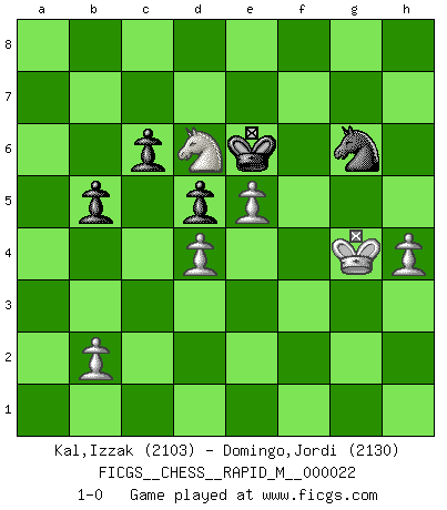 Last move : 1-0 2010 March 27 12:56:32 [Event "FICGS__CHESS__RAPID_M__000022"] [Site "FICGS"] [Date "2009.11.07"] [Round "1"] [White "Kal,Izzak"] [Black "Domingo,Jordi"] [Result "1-0"] [WhiteElo "2103"] [BlackElo "2130"] 1.e4 e5 2.Nf3 f5 3.Nxe5 Qf6 4.Nc4 fxe4 5.Nc3 Qg6 6.d3 Bb4 7.Bd2 Nf6 8.Nxe4 Bxd2+ 9.Qxd2 d5 10.Nxf6+ Qxf6 11.Qe3+ Be6 12.Ne5 O-O 13.d4 Nc6 14.Bd3 Bf5 15.O-O Bxd3 16.cxd3 Qd6 17.a3 Ne7 18.f4 Nf5 19.Qf2 h5 20.g3 Rae8 21.Rfe1 c6 22.Nf3 Nh6 23.Rxe8 Rxe8 24.Re1 Qg6 25.Qd2 Nf5 26.Kg2 a6 27.a4 Rf8 28.Qb4 Qf7 29.Ng5 Qd7 30.Re5 b5 31.axb5 axb5 32.Re6 Re8 33.Qe1 Rxe6 34.Nxe6 Qe7 35.Qe5 g6 36.Ng5 Qxe5 37.dxe5 Nd4 38.Nf3 Nf5 39.Nh4 Ne7 40.d4 Kf7 41.Kf3 Ke6 42.g4 hxg4+ 43.Kxg4 Kf7 44.f5 gxf5+ 45.Nxf5 Ng6 46.Nd6+ Ke6 47.h4 1-0 Latvian counter-gambit Kingside Castling by player Black (move 12) Kingside Castling by player White (move 15) Player White won this chess game. Follow this game move after move (download)A thorough understanding of the typical mating continuations makes the most complicated sacrificial combinations leading up to them not only not difficult, but almost a matter of course. (Siegbert Tarrasch) Schach wird sich dank seiner hohen kulturellen Tradition immer durchsetzen. In näherer Zukunft womöglich sogar als Gegenreaktion auf die maßlose Reizüberflutung im Freizeit- und Spielbereich. (Garry Kasparov) Solo puedes ser bueno en el Ajedrez si amas al juego. (Bobby Fischer) La conception d'un plan est le processus par lequel un joueur exploite les avantages de sa position tout en s'efforçant d'en réduire au minimum les inconvénients. Afin de garantir le succès, un plan doit toujours se fonder sur un diagnostic objectif des particularités d'une position. La conception d'un plan est d'autant plus difficile que la position est équilibrée, et grandement facilitée lorsqu'il n'existe qu'un seul plan susceptible de répondre aux exigences de la position. (Harry Golombek) If only faces could talk... (Pat Summerall, Sportscaster during the Super Bowl)