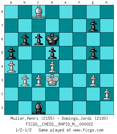 Last move : 1/2-1/2 2009 December 27 10:59:9 [Event "FICGS__CHESS__RAPID_M__000022"] [Site "FICGS"] [Date "2009.11.07"] [Round "1"] [White "Muller,Henri"] [Black "Domingo,Jordi"] [Result "1/2-1/2"] [WhiteElo "2155"] [BlackElo "2130"] 1.e4 e5 2.Nf3 f5 3.Nxe5 Qf6 4.d4 d6 5.Nc4 fxe4 6.Nc3 Qg6 7.f3 exf3 8.Qxf3 Nf6 9.Bd3 Qg4 10.Qxg4 Bxg4 11.O-O Nc6 12.Bg5 Be7 13.Ne3 Bd7 14.Rae1 O-O-O 15.Nf5 Bxf5 16.Bxf5+ Kb8 17.Ne2 Nd5 18.Bd2 Bh4 19.g3 Bf6 20.c3 Rde8 21.Nf4 Nxf4 22.Bxf4 Rxe1 23.Rxe1 Ne7 24.Bd3 Kc8 25.Kg2 Kd7 26.Bd2 c6 27.Rf1 h6 28.a4 Nd5 29.Bg6 Ne7 30.Bf7 Rf8 31.Bh5 Nc8 32.b3 d5 33.Bf4 Be7 34.Be5 Rxf1 35.Kxf1 Bf8 36.Bg4+ Kd8 37.Ke2 Nd6 38.Kd3 Nf7 39.Bb8 a5 40.Bf4 Bd6 41.Bd2 b6 42.Bf3 Ng5 43.Bg2 Ne6 44.Bf3 Ng5 45.Bg2 Ne6 46.Bh3 Ng5 47.Bxg5+ hxg5 48.Bg2 Kd7 49.Bf3 Ba3 50.Be2 Bc1 51.Bg4+ Kd6 52.Bh3 Ke7 53.Bc8 Kd6 54.Bf5 Ke7 55.Bc8 Kd6 1/2-1/2 Latvian counter-gambit Kingside Castling by player White (move 11) Queenside Castling by player Black (move 14) This chess game ended in a draw. Follow this game move after move (download)If a ruler does not understand Chess, how can he rule over a kingdom ? (King Khusros II) Wer mein Gambit spielt, muß bereit sein, alle Brücken hinter sich abzubrechen. Es verändert den ganzen Menschen. Es wirkt wie ein Zauberstab und fördert verkümmerte, gute Charakter- eigenschaften wieder zu Tage. (Emil Joseph Diemer) Yo siempre he tenido un ligero sentimiento de lástima por una persona que no tiene conocimiento del Ajedrez. (Siegbert Tarrasch) Aux échecs, les retours au sommet sont rares : les dommages psychologiques consécutifs à une défaite sont trop sévères. (Daily Telegraph) Memory is a way of holding onto the things you love, the things you are, the things you never want to lose. (from the television show: The Wonder Years)