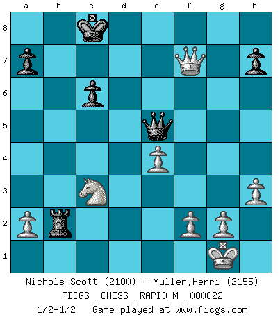 Last move : 1/2-1/2 2009 November 13 11:10:35 [Event "FICGS__CHESS__RAPID_M__000022"] [Site "FICGS"] [Date "2009.11.07"] [Round "1"] [White "Nichols,Scott"] [Black "Muller,Henri"] [Result "1/2-1/2"] [WhiteElo "2100"] [BlackElo "2155"] 1.e4 c5 2.Nf3 d6 3.d4 cxd4 4.c3 dxc3 5.Nxc3 Nc6 6.Bc4 e6 7.Qe2 Nf6 8.O-O Be7 9.Rd1 e5 10.Be3 O-O 11.h3 Be6 12.Bd5 Rc8 13.Bxc6 bxc6 14.Nxe5 Qa5 15.Nd3 Rfe8 16.Nf4 Bd7 17.Rac1 Rb8 18.Bd4 Rb7 19.Qf3 Rd8 20.Bxf6 Bxf6 21.Rxd6 Rxb2 22.Rxf6 gxf6 23.Nh5 Qe5 24.Nxf6+ Kf8 25.Rd1 Ke7 26.Nxd7 Rxd7 27.Rxd7+ Kxd7 28.Qxf7+ Kc8 29.Qg8+ Kb7 30.Qf7+ Kc8 31.Qg8+ Kb7 32.Qf7+ Kc8 1/2-1/2 Sicilian Kingside Castling by player White (move 8) Kingside Castling by player Black (move 10) This chess game ended in a draw. Follow this game move after move (download)Modern Chess is too much concerned with things like Pawn structure. Forget it, Checkmate ends the game. (Nigel Short) Glücklicherweise sind Großmeister Ruben Fines reine Schachbücher weniger phallozentrisch [als seine Schachpsychologie] und deswegen auch weniger lächerlich. (Nigel Short) Yo nunca en mi vida he jugado la Defensa Francesa, que viene siendo la más aburrida de todas las Aperturas. (Wilhelm Steinitz) Seul un grand joueur sait à quel point il joue faiblement. (Xavier Tartacover) A generalist learns less and less about more and more until he knows nothing about everything. (Author unknown)