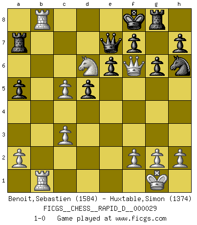 Last move : 1-0 2009 December 6 2:35:58 [Event "FICGS__CHESS__RAPID_D__000029"] [Site "FICGS"] [Date "2009.11.07"] [Round "1"] [White "Benoit,Sebastien"] [Black "Huxtable,Simon"] [Result "1-0"] [WhiteElo "1584"] [BlackElo "1374"] 1.e4 c6 2.d4 d5 3.e5 c5 4.Nf3 Nc6 5.dxc5 Bg4 6.Bb5 e6 7.b4 g6 8.c3 Bg7 9.O-O Bxf3 10.Qxf3 Bxe5 11.Bf4 Qc7 12.Bxe5 Qxe5 13.Bxc6+ bxc6 14.Nd2 a5 15.Nc4 Qc7 16.Nd6+ Kf8 17.Rfb1 Ra7 18.b5 cxb5 19.Rxb5 Nh6 20.Qf6 Rg8 21.Rab1 Qe7 22.Rb8+ 1-0 Caro-Kann : Advance variation Kingside Castling by player White (move 9) Player White won this chess game. Follow this game move after move (download)A chess genius has died; a loss for humanity. (Viktor Kortchnoi, about Bobby Fischer's death) Er war ein guter Schachspieler, aber ich kann Leute nicht ausstehen, die 'Heil Hitler' rufen (Über Alexander Aljechin). (Miguel Najdorf) No nos podemos resistir a la fascinación de un sacrificio ya que la pasión por los sacrificios es parte de la naturaleza de un jugador de Ajedrez. (Rudolf Spielman) Toutes les manuvres exécutées sur une colonne ouverte ont pour but ultime l'intrusion définitive sur la septième ou la huitième rangée, en plein cur de la position ennemie. (Aaron Nimzovitch) The greatest con, that he ever pulled... was making you believe... that he is you. (Revolver, movie)