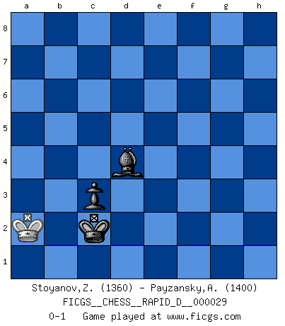 Last move : 0-1 2009 November 12 8:54:41 [Event "FICGS__CHESS__RAPID_D__000029"] [Site "FICGS"] [Date "2009.11.07"] [Round "1"] [White "Stoyanov,Zdravko"] [Black "Payzansky,Aleksey"] [Result "0-1"] [WhiteElo "1360"] [BlackElo "1400"] 1.e4 c5 2.Nf3 d6 3.h3 Nc6 4.Bb5 Bd7 5.d3 g6 6.c3 Bg7 7.Bxc6 Bxc6 8.O-O Nf6 9.Bg5 O-O 10.Nbd2 b5 11.a3 a5 12.Re1 Nd7 13.d4 cxd4 14.Nxd4 Rc8 15.Nxc6 Rxc6 16.Nf3 h6 17.Bh4 g5 18.Bg3 e5 19.Nh2 f5 20.exf5 Rxf5 21.Qh5 Kh7 22.Ng4 Nf6 23.Nxf6+ Qxf6 24.Rad1 Qf7 25.Qxf7 Rxf7 26.Rd5 Rb7 27.Red1 Bf8 28.f3 Kg6 29.h4 Be7 30.hxg5 hxg5 31.Bh2 b4 32.axb4 axb4 33.cxb4 Rxb4 34.R1d2 Rcb6 35.g3 g4 36.f4 e4 37.f5+ Kf6 38.Kg2 e3 39.Re2 Rxb2 40.Kf1 Rxe2 41.Kxe2 Rb2+ 42.Kxe3 Rxh2 43.Kf4 Rc2 44.Kxg4 Rc5 45.Rxc5 dxc5 46.Kf4 Bd6+ 47.Ke4 Bxg3 48.Kd5 Bf2 49.Kc4 Kxf5 50.Kd5 Bd4 51.Kc4 Ke4 52.Kb3 Kd3 53.Ka2 Kc2 54.Ka3 c4 55.Ka2 c3 0-1 Sicilian Kingside Castling by player White (move 8) Kingside Castling by player Black (move 9) 10 pieces endgame at move 42 : White KRBPP , Black KRBPP WHITE : King + 1 Rook 1 Bishop 2 Pawns BLACK : King + 1 Rook 1 Bishop 2 Pawns 9 pieces endgame at move 42 : White KRPP , Black KRBPP WHITE : King + 1 Rook 2 Pawns BLACK : King + 1 Rook 1 Bishop 2 Pawns 8 pieces endgame at move 44 : White KRPP , Black KRBP WHITE : King + 1 Rook 2 Pawns BLACK : King + 1 Rook 1 Bishop 1 Pawn 7 pieces endgame at move 45 : White KRPP , Black KBP WHITE : King + 1 Rook 2 Pawns BLACK : King + 1 Bishop 1 Pawn 6 pieces endgame at move 45 : White KPP , Black KBP WHITE : King + 2 Pawns BLACK : King + 1 Bishop 1 Pawn 5 pieces endgame at move 47 : White KP , Black KBP WHITE : King + 1 Pawn BLACK : King + 1 Bishop 1 Pawn 4 pieces endgame at move 49 : White K , Black KBP WHITE : King + BLACK : King + 1 Bishop 1 Pawn Player Black won this chess game. Follow this game move after move (download)A sacrifice is best refuted by accepting it. (Wilhelm Steinitz) Kasparov stellt für gewöhnlich die Regeln auf und bricht sie dann selbst wieder. (Alexej Shirov) Cada Peón es una Reina en potencia. (James Mason) Botvinnik disait en comparant les échecs à la musique: Il existe une science dont le but est l'étude de l'acoustique et des sons. Mais il y a aussi un art qui se sert de l'océan des sons : c'est la musique. De toute évidence, il en est de même pour la pensée. La logique est l'étude des lois de la réflexion et les échecs reflètent, en tant qu'art, le côté logique de la réflexion, sous la forme d'images artistiques... Extrait de Fischer - Spassky, Reykjavik 1972 par Alexander & F. Wyndham (Ed. Solar), p 37. Quotation,n.: The act of repeating erroneously the words of another. The words erroneously repeated. (Ambrose Bierce, The Devil's Dictionary)