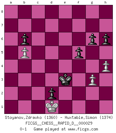 Last move : 0-1 2010 January 6 21:52:8 [Event "FICGS__CHESS__RAPID_D__000029"] [Site "FICGS"] [Date "2009.11.07"] [Round "1"] [White "Stoyanov,Zdravko"] [Black "Huxtable,Simon"] [Result "0-1"] [WhiteElo "1360"] [BlackElo "1374"] 1.e4 c6 2.Nf3 d5 3.e5 Bg4 4.Be2 e6 5.h3 Bxf3 6.Bxf3 Nd7 7.d4 c5 8.b3 cxd4 9.Qxd4 Bc5 10.Qf4 Qb6 11.Be3 Bb4+ 12.c3 Bc5 13.Bxc5 Nxc5 14.O-O Ne7 15.Nd2 Nf5 16.Bg4 Nh6 17.Bh5 O-O 18.Nf3 Ne4 19.Nd4 Nxc3 20.Rfc1 Rac8 21.Qe3 Ne4 22.Bf3 Nc5 23.Rc3 Rc7 24.Rac1 Rfc8 25.a3 Nd7 26.Be2 Nf5 27.Nxf5 Rxc3 28.Rxc3 Rxc3 29.Qxc3 exf5 30.b4 Kf8 31.a4 Ke7 32.a5 Qh6 33.Bf3 Qc6 34.Qd4 Ke6 35.Be2 b6 36.b5 Qc1+ 37.Kh2 Qc5 38.Qxc5 Nxc5 39.axb6 axb6 40.f4 Ne4 41.Bd3 f6 42.Be2 fxe5 43.fxe5 Kxe5 44.Bd3 Kd4 45.Be2 Ke3 46.Bf1 Nd2 47.Kg1 Nxf1 48.Kxf1 d4 49.Ke1 d3 50.h4 d2+ 51.Kd1 g6 52.g3 h6 0-1 Caro-Kann defense Kingside Castling by player White (move 14) Kingside Castling by player Black (move 17) 10 pieces endgame at move 48 : White KPPP , Black KPPPPP WHITE : King + 3 Pawns BLACK : King + 5 Pawns Player Black won this chess game. Follow this game move after move (download)All I want to do, ever, is just play Chess. (Bobby Fischer) Das Zentrum ist der Balkan des Schachbretts - Kriegshandlungen können in jedem Moment ausbrechen. (Aaron Nimzowitsch) Debes de llevar a tu oponente hacia un profundo y obscuro bosque donde 2+2=5, y el camino que conduce a la salida es suficientemente ancho para solamente uno. (Mikhail Tal) On entre au jeu d'Echecs comme on entre en Religion. Pour le joueur d'Echecs, la partie d'Echecs c'est l'office, la messe, le défilé du 1er Mai, le dépôt de gerbe au Monument aux Morts. C'est un drame sacré. (Michel Roos) But they are useless. They can only give you answers. (Pablo Picasso, about computers)