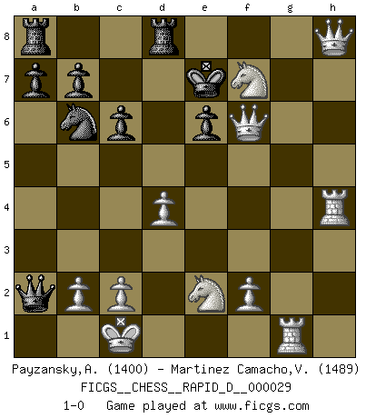 Last move : 1-0 2009 November 27 19:41:43 [Event "FICGS__CHESS__RAPID_D__000029"] [Site "FICGS"] [Date "2009.11.07"] [Round "1"] [White "Payzansky,Aleksey"] [Black "Martinez Camacho,Victor Hugo"] [Result "1-0"] [WhiteElo "1400"] [BlackElo "1489"] 1.e4 c6 2.d4 d5 3.Nc3 dxe4 4.Nxe4 Bf5 5.Ng3 Bg6 6.h4 h6 7.Nf3 e6 8.h5 Bh7 9.Bd3 Bxd3 10.Qxd3 Nf6 11.Bf4 Bd6 12.Bxd6 Qxd6 13.O-O-O O-O 14.Rh4 Nbd7 15.Ne2 Nb6 16.g4 Rfd8 17.g5 hxg5 18.Nxg5 Qd5 19.Rg1 Qxa2 20.h6 g6 21.h7+ Kh8 22.Nxf7+ Kg7 23.Qxg6+ Kf8 24.h8Q+ Ke7 25.Qgxf6+ 1-0 Caro-Kann : Classical, 6.h4 Queenside Castling by player White (move 13) Kingside Castling by player Black (move 13) Promotion Queen by player White (move 24) Player White won this chess game. Follow this game move after move (download)By the beauty of his games, the clarity of his play, and the brilliance of his ideas, Fischer made himself an artist of the same stature as Brahms, Rembrandt, and Shakespeare. (David Levy) Stelle das Brett so, daß die Sonne in die Augen deines Gegners scheint. (Ruy López) Aquel que toma al Peón de Caballo de la Reina, se pasará la noche a dormir en la calle. (Anónimo) Je crois qu'il existe des manières très spécifiques de jouer efficacement contre une machine. Evidemment, nous n'avons aucune chance en technique pure, parce que l'ordinateur calcule de manière parfaite. Mais lorsque nous faisons appel à notre cerveau, en utilisant l'intuition et la compréhension, alors nous restons beaucoup plus forts. (Anatoli Karpov) He who laughs last probably does not get the joke. (Unknown)