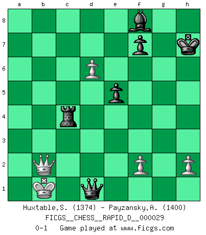 Last move : 0-1 2010 February 1 13:46:31 [Event "FICGS__CHESS__RAPID_D__000029"] [Site "FICGS"] [Date "2009.11.07"] [Round "1"] [White "Huxtable,Simon"] [Black "Payzansky,Aleksey"] [Result "0-1"] [WhiteElo "1374"] [BlackElo "1400"] 1.d4 Nf6 2.c4 g6 3.Nc3 d5 4.Nf3 Bg7 5.Qb3 dxc4 6.Qxc4 O-O 7.e4 Nc6 8.Be2 e5 9.d5 Na5 10.Qd3 Qe7 11.O-O a6 12.Rb1 b5 13.b4 Nc4 14.Qc2 Nd6 15.Be3 Bb7 16.Bc5 c6 17.dxc6 Bxc6 18.Rbd1 Rfd8 19.Rfe1 Rac8 20.Qd2 Qe6 21.Ng5 Qe8 22.Qe3 Nb7 23.Rxd8 Qxd8 24.Bb6 Qd6 25.a3 Be8 26.Ba7 h6 27.Nh3 a5 28.Rd1 Qa6 29.Nd5 Nxd5 30.exd5 axb4 31.axb4 Bd7 32.Bc5 g5 33.g4 Qa4 34.Be7 Re8 35.Bc5 Nxc5 36.bxc5 Bxg4 37.c6 Bxe2 38.Qxe2 b4 39.c7 Qd7 40.d6 Bf8 41.Qc4 Rc8 42.Nxg5 hxg5 43.Qxb4 Rxc7 44.Qd2 Qg4+ 45.Kh1 Qf3+ 46.Kg1 Rc4 47.Qxg5+ Kh7 48.Qd2 Rg4+ 49.Kf1 Qh1+ 50.Ke2 Re4+ 51.Kd3 Qf3+ 52.Kc2 Rc4+ 53.Kb1 Qb3+ 54.Qb2 Qxd1+ 0-1 King's Indian defense, 3.Nc3 Kingside Castling by player Black (move 6) Kingside Castling by player White (move 11) Player Black won this chess game. Follow this game move after move (download)No one ever won a game by resigning. (Unknown) Garry Kasparov war erst in der Großmeister-Organisation GMA, dann in der Profischach-Vereinigung PCA, zum Schluss kehrte er wieder in den Schoß der FIDE zurück. Aber gut, manche Leute sind flexibel (Viswanathan Anand) Repentinamente, me resultaba obvio en mi analisis que yo había pasado por alto lo que Fischer había visto en el tablero con la mas grande facilidad. (Mikhail Botvinnik) Je ne suis pas le dernier à jouer lâchement des coups douteux pendant le zeïtnot de l'adversaire pour l'achever: en effet les coups qui font le plus peur sont ceux que l'on ne comprend pas. Je me fais souvent peur quand je joue. (Un professeur anonyme) Life is like a game of cards: the hand you are dealt represents determinism; the way you play it is free will. (Jawaharlal Nehru)