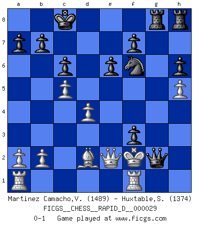 Last move : 0-1 2009 December 29 20:10:23 [Event "FICGS__CHESS__RAPID_D__000029"] [Site "FICGS"] [Date "2009.11.07"] [Round "1"] [White "Martinez Camacho,Victor Hugo"] [Black "Huxtable,Simon"] [Result "0-1"] [WhiteElo "1489"] [BlackElo "1374"] 1.e4 c6 2.d4 d5 3.Nd2 dxe4 4.Nxe4 Bf5 5.Ng3 Bg6 6.h4 h6 7.Nf3 Nf6 8.c3 Nbd7 9.Bd3 Bxd3 10.Qxd3 Qc7 11.Be3 e6 12.O-O Bd6 13.Ne4 Nxe4 14.Qxe4 Nf6 15.Qd3 Nd5 16.Bd2 O-O-O 17.c4 Nf6 18.g3 Rdg8 19.c5 Bxg3 20.fxg3 Qxg3+ 21.Kh1 Qh3+ 22.Kg1 g5 23.h5 g4 24.Qe2 gxf3 25.Kf2 Qg2+ 0-1 Caro-Kann : 3.Nd2 Kingside Castling by player White (move 12) Queenside Castling by player Black (move 16) Player Black won this chess game. Follow this game move after move (download)You cannot play at Chess if you are kind-hearted. (French Proverb) Schach ist eine Sache der genauen Beurteilung, wann man zuschlagen und wann man sich ducken muss. (Robert James Fischer) Fischer no está bajo la obligación de nadie. (Joseph Platz) Aux échecs, l'amour-propre est satisfait quand on remporte la victoire, mais il n'y a pas de honte à être battu. (Benjamin Franklin) A woman without a man is like a fish without a bicycle. (Gloria Steinem)