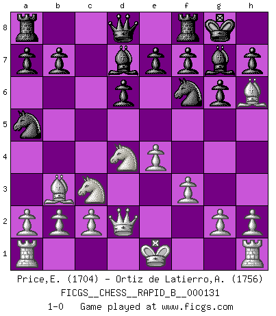 Last move : 1-0 2009 December 31 20:19:12 [Event "FICGS__CHESS__RAPID_B__000131"] [Site "FICGS"] [Date "2009.11.08"] [Round "1"] [White "Price,Eric"] [Black "Ortiz de Latierro,Aitor"] [Result "1-0"] [WhiteElo "1704"] [BlackElo "1756"] 1.e4 c5 2.Nf3 Nc6 3.d4 cxd4 4.Nxd4 g6 5.Nc3 Bg7 6.Be3 Nf6 7.Bc4 O-O 8.Bb3 d6 9.f3 Bd7 10.Qd2 Na5 11.Bh6 1-0 This chess game has been lost on time (started : 2009.11.08 6:18:8) Sicilian : Accelerated Fianchetto, Modern variation with Bc4 Kingside Castling by player Black (move 7) Player White won this chess game. Follow this game move after move (download)Nothing excites jaded Grandmasters more than a theoretical novelty. (Dominic Lawson) Auf Remis zu spielen ist gewissermaßen ein Verbrechen gegen das Schachspiel. (Mikhail Nekhemyevich Tal) Solo puedes ser bueno en el Ajedrez si amas al juego. (Bobby Fischer) Le pion, dans sa simplicité, marche droit devant lui, mais lorsqu'il prend, il le fait obliquement? Ainsi l'homme, tant qu'il reste pauvre, marche dans la droiture et vit honnêtement, mais lorsqu'il recherche les honneurs, il flatte, se parjure et, par les voies obliques, cherche une position supérieure sur l'échiquier du monde. (Jean de Galles) All art requires courage. (Anne Tucker)