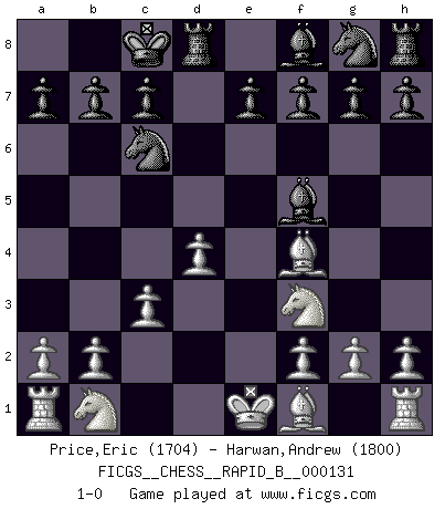 Last move : 1-0 2009 December 18 7:50:52 [Event "FICGS__CHESS__RAPID_B__000131"] [Site "FICGS"] [Date "2009.11.08"] [Round "1"] [White "Price,Eric"] [Black "Harwan,Andrew"] [Result "1-0"] [WhiteElo "1704"] [BlackElo "1800"] 1.e4 d5 2.exd5 Qxd5 3.Qf3 Qxf3 4.Nxf3 Nc6 5.d4 Bf5 6.c3 O-O-O 7.Bf4 1-0 This chess game has been lost on time (started : 2009.11.08 6:18:8) Scandinavian (centre counter) defense Queenside Castling by player Black (move 6) Player White won this chess game. Follow this game move after move (download)I know people who have all the will in the world, but still can't play good Chess. (Bobby Fischer) Ich erzeugte keinen Neid, da mich die Schachspieler als Musiker und die Musiker als Schachspieler betrachteten. (Mark Taimanov) Todavía soy una víctima del Ajedrez. Tiene toda la belleza del arte y mucho mas. No puede ser comercializado. El Ajedrez es mas puro que el arte en su posición social. (Marcel Duchamp) Même un GMI sait rarement calculer sur plus de cinq coups une attaque à sacrifices. (Rudolf Spielmann) Crush them ! Make them suffer ! (General Grievous in Star Wars ep.3)