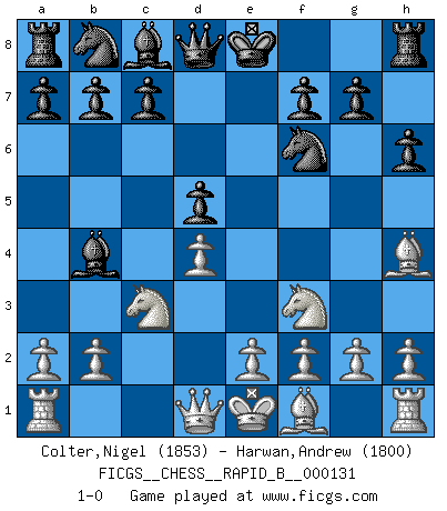 Last move : 1-0 2009 December 31 8:18:31 [Event "FICGS__CHESS__RAPID_B__000131"] [Site "FICGS"] [Date "2009.11.08"] [Round "1"] [White "Colter,Nigel"] [Black "Harwan,Andrew"] [Result "1-0"] [WhiteElo "1853"] [BlackElo "1800"] 1.d4 d5 2.Nf3 e6 3.c4 Nf6 4.cxd5 exd5 5.Nc3 Bb4 6.Bg5 h6 7.Bh4 1-0 This chess game has been lost on time (started : 2009.11.08 6:18:8) Queen's pawn game Player White won this chess game. Follow this game move after move (download)A Chess game is a dialogue, a conversation between a player and his opponent. Each move by the opponent may contain threats or be a blunder, but a player cannot defend against threats or take advantage of blunders if he does not first ask himself: What is my opponent planning after each move ? (Bruce A. Moon) In Buenos Aires ist es nicht mein vorrangiges Ziel ein starkes Turnier zu organisieren, sondern ein Turnier für Gentlemen. Ich würde nie Kamsky einladen. Ich mag keine Probleme. (Miguel Najdorf) Una victoria por una combinación errónea, aunque sea espectacular, me llena de horror artístico. (Wilhelm Steinitz) Aux échecs, l'amour-propre est satisfait quand on remporte la victoire, mais il n'y a pas de honte à être battu. (Benjamin Franklin) You think that education is too expensive ? Try ignorance. (Derek Bok)
