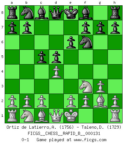 Last move : 0-1 2010 January 18 20:19:36 [Event "FICGS__CHESS__RAPID_B__000131"] [Site "FICGS"] [Date "2009.11.08"] [Round "1"] [White "Ortiz de Latierro,Aitor"] [Black "Taleno,David"] [Result "0-1"] [WhiteElo "1756"] [BlackElo "1729"] 1.Nf3 d5 2.d4 e6 3.g3 Nf6 4.Bg2 c5 0-1 This chess game has been lost on time (started : 2009.11.08 6:18:8) Reti Opening Player Black won this chess game. Follow this game move after move (download)Chess is mental torture. (Garry Kasparov) Du kannst im Schach nur gut werden, wenn du das Spiel liebst. (Robert James Fischer) Fischer era un maestro de claridad y un Rey del posicionamiento astuto. Sus oponentes podían ver hacia donde se dirigía pero eran impotentes para detenerlo. (Bruce Pandolfini) Il n'y a pas eu de défaite parce que je ne crois pas que cet ordinateur ait jamais existé. IBM a triché en refusant d'imprimer les modes de recherche de la machine. C'est évident, pendant le match, des coups décisifs ont été joués par des êtres humains. Aujourd'hui, les meilleurs spécialistes en informatique ne peuvent toujours pas expliquer comment Deep-Blue a pu jouer contre la logique des ordinateurs. IBM a gagné une guerre de communication, mais ils sont incapables de prouver que l'ordinateur a gagné tout seul. (Garry Kasparov) A good player is always lucky. (Capablanca)