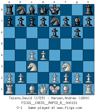 Last move : 0-1 2010 February 4 20:19:14 [Event "FICGS__CHESS__RAPID_B__000131"] [Site "FICGS"] [Date "2009.11.08"] [Round "1"] [White "Taleno,David"] [Black "Harwan,Andrew"] [Result "0-1"] [WhiteElo "1729"] [BlackElo "1800"] 1.Nf3 g6 2.d4 Bg7 3.c4 e6 4.Nc3 Ne7 0-1 This chess game has been lost on time (started : 2009.11.08 6:18:8) Reti Opening Player Black won this chess game. Follow this game move after move (download)Fischer wanted to give the Russians a taste of their own medicine. (Larry Evans) In der Schule lernt man nichts. Es ist nur Zeitverschwendung. (Robert James Fischer) Nos gusta pensar. (Gary Kasparov) J'apprécie les joueurs d'est-indienne, c'est grâce à eux que je nourris ma famille depuis tant d'années. (Petrosian) No man has ever achieved immortality in his own life time. (Unknown)