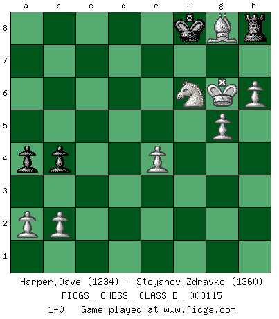 Last move : 1-0 2009 December 17 7:34:4 [Event "FICGS__CHESS__CLASS_E__000115"] [Site "FICGS"] [Date "2009.11.08"] [Round "1"] [White "Harper,Dave"] [Black "Stoyanov,Zdravko"] [Result "1-0"] [WhiteElo "1234"] [BlackElo "1360"] 1.e4 c5 2.Nf3 a6 3.d4 cxd4 4.Nxd4 e5 5.Nf3 h6 6.Nc3 Bb4 7.Bd2 Nf6 8.Nxe5 d6 9.Nf3 Bg4 10.Be2 Bxc3 11.Bxc3 Nxe4 12.Bxg7 Rh7 13.Qd4 d5 14.O-O Nc6 15.Qe3 Rxg7 16.Rad1 Bh3 17.Qxe4+ Qe7 18.Qxe7+ Nxe7 19.g3 Bxf1 20.Kxf1 Kd7 21.c4 Kc6 22.cxd5+ Nxd5 23.Nd4+ Kb6 24.Nf5 Ne3+ 25.fxe3 Rh7 26.Rd6+ Kc5 27.Rxh6 R7h8 28.Rxh8 Rxh8 29.h4 b5 30.Bd3 Rd8 31.Ke2 a5 32.g4 b4 33.h5 f6 34.Ng3 Rh8 35.Ne4+ Kc6 36.Nxf6 Rh6 37.g5 Rh8 38.h6 Kd6 39.Bh7 Ke6 40.Kf3 Ke5 41.e4 Ke6 42.Kf4 a4 43.Bg8+ Ke7 44.Kf5 Kf8 45.Kg6 1-0 Sicilian : O'Kelly variation Kingside Castling by player White (move 14) Player White won this chess game. Follow this game move after move (download)Strategy requires thought, tactics require observation. (Max Euwe) Die Arbeit ist etwas Unnatürliches. Die Faulheit allein ist göttlich. (Anatole France) No hay precio que no valga la pena por la cabellera del Rey enemigo. (Koblentz) Tout change constamment, y compris dans le monde des Echecs. (Botvinnik) Thus, what is of supreme importance in war is to attack the enemy's strategy. (Sun Tzu)