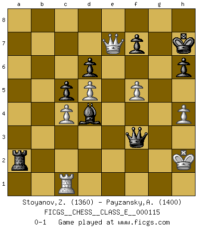 Last move : 0-1 2009 November 10 15:16:51 [Event "FICGS__CHESS__CLASS_E__000115"] [Site "FICGS"] [Date "2009.11.08"] [Round "1"] [White "Stoyanov,Zdravko"] [Black "Payzansky,Aleksey"] [Result "0-1"] [WhiteElo "1360"] [BlackElo "1400"] 1.e4 c5 2.Nf3 d6 3.h3 Nc6 4.Bb5 Bd7 5.d3 g6 6.c3 Bg7 7.Bxc6 Bxc6 8.O-O Nf6 9.Be3 O-O 10.Nbd2 b5 11.a3 a5 12.Bg5 b4 13.axb4 axb4 14.d4 Qc7 15.d5 bxc3 16.bxc3 Bd7 17.Rxa8 Rxa8 18.c4 h6 19.Bh4 g5 20.Bg3 Nh5 21.Bh2 g4 22.Nh4 Nf6 23.Nf5 Bxf5 24.exf5 gxh3 25.gxh3 Qd7 26.Qb1 Nh7 27.Kh1 Ng5 28.h4 Nh7 29.Rg1 Nf6 30.Bf4 Kh7 31.Ne4 Qa4 32.Rc1 Qa2 33.Qb7 Nxe4 34.Be3 Nxf2+ 35.Bxf2 Qxf2 36.Qxe7 Qf3+ 37.Kg1 Bd4+ 38.Kh2 Ra2+ 0-1 Sicilian Kingside Castling by player White (move 8) Kingside Castling by player Black (move 9) Player Black won this chess game. Follow this game move after move (download)Chess is mental torture. (Garry Kasparov) Stelle das Brett so, daß die Sonne in die Augen deines Gegners scheint. (Ruy López) Aquel que toma al Peón de Caballo de la Reina, se pasará la noche a dormir en la calle. (Anónimo) Des points faibles ou des trous dans la position de l'adversaire doivent être occupés par des pièces et non pas par des pions. (Siegbert Tarrasch) To err is human, to shift the blame on someone else is tactical. (Mladen Jankovic)