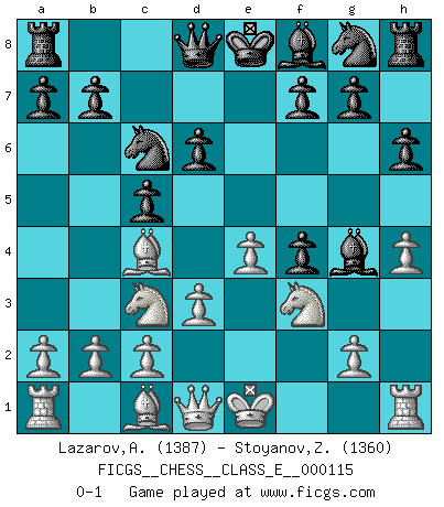 Last move : 0-1 2009 December 22 19:53:3 [Event "FICGS__CHESS__CLASS_E__000115"] [Site "FICGS"] [Date "2009.11.08"] [Round "1"] [White "Lazarov,Alexander"] [Black "Stoyanov,Zdravko"] [Result "0-1"] [WhiteElo "1387"] [BlackElo "1360"] 1.e4 c5 2.f4 Nc6 3.Nc3 e5 4.Nf3 exf4 5.Bc4 h6 6.h4 d6 7.d3 Bg4 0-1 This chess game has been lost on time (started : 2009.11.08 11:40:58) Sicilian : Grand Prix attack Player Black won this chess game. Follow this game move after move (download)An attack on the wing should be met by play in the center. (Nimzovitch) Frage: Wie viele Autos haben Sie schon zerstört? - Antwort: Nur zwei. (Loek van Wely) Un entendimiento minucioso de las típicas continuaciones de mate hacen de las mas complicadas combinaciones de sacrificio que conducen hacia ellas no solo no dificiles, sino casi un asunto de rutina. (Siegbert Tarrasch) Un journaliste : 'Vous préférez avoir une dame de plus sur l'échiquier ou au lit ?' Boris Spassky : 'Ca dépend de la position.' Question: Is 'This statement is paradoxical' a paradoxical statement ? Or is it a meta-paradox ? (Normajean Yates)
