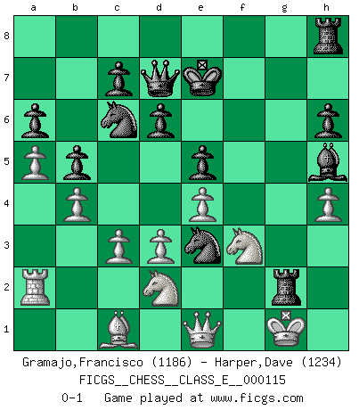 Last move : 0-1 2009 November 27 18:4:46 [Event "FICGS__CHESS__CLASS_E__000115"] [Site "FICGS"] [Date "2009.11.08"] [Round "1"] [White "Gramajo,Francisco"] [Black "Harper,Dave"] [Result "0-1"] [WhiteElo "1186"] [BlackElo "1234"] 1.e4 e5 2.Nf3 Nc6 3.Bb5 a6 4.Bc4 Bc5 5.O-O d6 6.c3 Nf6 7.Bxf7+ Kxf7 8.Ng5+ Ke7 9.d3 h6 10.Nf3 Bg4 11.Nbd2 Qd7 12.b4 Ba7 13.a4 b5 14.a5 g5 15.h3 Bh5 16.h4 g4 17.Nh2 g3 18.Nhf3 gxf2+ 19.Rxf2 Bxf2+ 20.Kxf2 Ng4+ 21.Kg1 Rag8 22.Ra2 Ne3 23.Qe1 Rxg2+ 0-1 Ruy Lopez (Spanish Opening) Kingside Castling by player White (move 5) Player Black won this chess game. Follow this game move after move (download)Fischer is completely natural. He plays no roles. He's like a child. Very, very simple. (Zita Rajcsanyi) Schach ist ein Reich, wo sich die menschliche Phantasie frei entfalten kann. (David Bronstein) El Ajedrez, como la música, como el amor, tiene el poder de hacer feliz a la gente. (Siegbert Tarrasch) Toutes les manuvres exécutées sur une colonne ouverte ont pour but ultime l'intrusion définitive sur la septième ou la huitième rangée, en plein cur de la position ennemie. (Aaron Nimzovitch) I believe in luck. How else can you explain the success of those you dislike ? (Jean Cocteau)