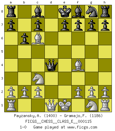 Last move : 1-0 2009 November 8 23:57:1 [Event "FICGS__CHESS__CLASS_E__000115"] [Site "FICGS"] [Date "2009.11.08"] [Round "1"] [White "Payzansky,Aleksey"] [Black "Gramajo,Francisco"] [Result "1-0"] [WhiteElo "1400"] [BlackElo "1186"] 1.e4 d5 2.exd5 Qxd5 3.Nc3 Qe5+ 4.Be2 b6 5.d4 Qd6 6.Bf3 Nc6 7.Bf4 Qxd4 8.Bxc6+ 1-0 Scandinavian (centre counter) defense Player White won this chess game. Follow this game move after move (download)Bobby Fischer is the greatest Chess player who has ever lived. (Ken Smith) Das Schachspiel hat wie die Liebe, die Musik, die Fähigkeit, den Menschen glücklich zu machen. Ich habe ein leises Gefühl des Bedauerns für jeden, der das Schachspiel nicht kennt, so wie ich jeden bedaure, der die Liebe nicht kennt. (Siegbert Tarrasch) Ser exitoso en el Ajedrez te permite descubrir tu propia personalidad. Eso es lo que deseo para los niños de mi clase. (Saudin Robovic) Les Cavaliers se révèlent fort utiles dans les positions fermées. D'habitude, les Fous sont un peu plus forts que les Cavaliers dans les positions ouvertes. Qu'on le veuille ou non, il restera toujours des exceptions ! Beep ! (R2D2 in Star Wars ep.3)