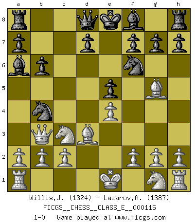 Last move : 1-0 2010 February 13 8:43:4 [Event "FICGS__CHESS__CLASS_E__000115"] [Site "FICGS"] [Date "2009.11.08"] [Round "1"] [White "Willis,Jonathan"] [Black "Lazarov,Alexander"] [Result "1-0"] [WhiteElo "1324"] [BlackElo "1387"] 1.e4 c5 2.d4 cxd4 3.Qxd4 Nc6 4.Qc4 Nf6 5.Nc3 Ne5 6.Qd4 Nc6 7.Qc5 e5 8.Qc4 Nb4 9.Bd3 b6 10.Bg5 Ba6 11.Qb3 1-0 This chess game has been lost on time (started : 2009.11.08 11:40:58) Sicilian : Smith-Morra gambit Player White won this chess game. Follow this game move after move (download)Dazzling combinations are for the many, shifting wood is for the few. (Georg Kieninger) Schach ist das Spiel, das die Verrückten gesund hält. (Albert Einstein) Mi estilo es algo parecido entre un poco de Tal y Petrosian. (Reshevsky) Il n'y a pas eu de défaite parce que je ne crois pas que cet ordinateur ait jamais existé. IBM a triché en refusant d'imprimer les modes de recherche de la machine. C'est évident, pendant le match, des coups décisifs ont été joués par des êtres humains. Aujourd'hui, les meilleurs spécialistes en informatique ne peuvent toujours pas expliquer comment Deep-Blue a pu jouer contre la logique des ordinateurs. IBM a gagné une guerre de communication, mais ils sont incapables de prouver que l'ordinateur a gagné tout seul. (Garry Kasparov) Rules and bones are meant to be broken. (Anonymous)