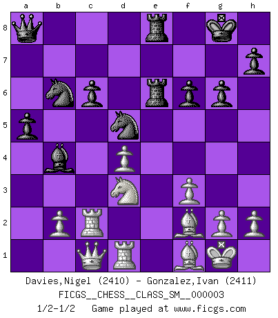 Last move : 1/2-1/2 2006 November 2 22:0:54 [Event "FICGS__CHESS__CLASS_SM__000003"] [Site "FICGS"] [Date "2006.10.03"] [Round "1"] [White "Davies,Nigel"] [Black "Gonzalez,Ivan"] [Result "1/2-1/2"] [WhiteElo "2410"] [BlackElo "2411"] 1.d4 d5 2.Nf3 Nf6 3.c4 c6 4.Nc3 dxc4 5.a4 Bf5 6.Nh4 e6 7.Nxf5 exf5 8.e3 Bb4 9.Bxc4 O-O 10.Qc2 g6 11.O-O Nbd7 12.f3 Rc8 13.Rd1 Qe7 14.e4 fxe4 15.Nxe4 Nd5 16.a5 b5 17.axb6 N7xb6 18.Ba6 Rc7 19.Bg5 Qe6 20.Nc5 Qd6 21.Bf1 f6 22.Bh4 Re7 23.Ne4 Qd7 24.Rac1 Qc8 25.Bf2 a5 26.Qb1 Rfe8 27.Rc2 Qa8 28.Qc1 Re6 29.Nc5 R6e7 30.Nd3 Re6 31.Nc5 R6e7 32.Nd3 Re6 1/2-1/2 Queen's pawn game Kingside Castling by player Black (move 9) Kingside Castling by player White (move 11) This chess game ended in a draw. Follow this game move after move (download)Any material change in a position must come about by mate, a capture, or a Pawn promotion. (Purdy) Die jungen Leute sollen verstehen, dass sie noch etwas von mir lernen können und müssen. (Viktor Kortschnoi) Yo adoro todas la posiciones. Denme una partida posicional difícil, y la jugaré. Pero posiciones totalmente ganadas, no las tolero. (Hein Donner) Dans le domaine de la peinture, de la gravure et de la sculpture, dès la première décennie de notre siècle, les artistes abandonnent la représentation de la partie d'échecs pour se concentrer sur les pièces, sur les échiquiers et sur toutes les variations auxquelles les unes et les autres peuvent donner lieu. On passe en quelque sorte d'un thème social à un thème musical (au sens de la musica médiévale, c'est-à-dire d'une notion qui inclue le rythme, l'harmonie, la construction et la déconstruction, etc.). Graphiquement et picturalement, l'échiquier apparaît comme une structure ouverte, dynamique, d'une richesse infinie, autorisant toutes les combinatoires et débouchant sur des mouvements et des rythmes de nature exponentielle. (Michel Pastoureau) If I had no sense of humor, I would long ago have committed suicide. (Mahatma Gandhi)