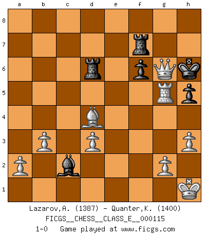 Last move : 1-0 2010 February 22 21:11:52 [Event "FICGS__CHESS__CLASS_E__000115"] [Site "FICGS"] [Date "2009.11.08"] [Round "1"] [White "Lazarov,Alexander"] [Black "Quanter,Kirsty"] [Result "1-0"] [WhiteElo "1387"] [BlackElo "1400"] 1.e4 c5 2.f4 d5 3.exd5 Qxd5 4.Nc3 Qd7 5.Nf3 Nc6 6.Bb5 a6 7.Ne5 axb5 8.Nxd7 Bxd7 9.Nxb5 Na5 10.Nc3 g6 11.d3 h5 12.Qe2 Bg4 13.Qf2 Bh6 14.Qxc5 Nc6 15.O-O Nf6 16.h3 Bd7 17.Bd2 O-O 18.Nd5 Nxd5 19.Qxd5 Rad8 20.Qc5 e5 21.Rad1 f6 22.Qd5+ Kh7 23.fxe5 Nxe5 24.Bc3 Be3+ 25.Kh1 Bg4 26.Qxb7+ Rf7 27.Qe4 Bxd1 28.Qxe3 Bxc2 29.Bxe5 Kg7 30.Bd4 g5 31.b3 Kg6 32.Qe4+ Kg7 33.Rf5 Rd6 34.Rxg5+ Kh6 35.Qg6+ 1-0 Sicilian : Grand Prix attack Kingside Castling by player White (move 15) Kingside Castling by player Black (move 17) Player White won this chess game. Follow this game move after move (download)Chess mastery essentially consists of analyzing Chess positions accurately. (Mikhail Botvinnik) Man kann eine Schachpartie nur gewinnen, wenn das Gleichgewicht gestört ist. In einer Stellung mit ungestörtem Gleichgewicht ist auch das größte Genie hilflos - in der Stellung steckt dann eben kein genialer Einfall. (Wilhelm Steinitz) Bendita sea la memoria de aquel que dio al mundo este juego inmortal. (A. G. Gardiner) L'attaque fait le spectacle, la défense gagne les matchs. (Dicton footballistique) Always be a first-rate version of yourself, instead of a second-rate version of somebody else. (Judy Garland)