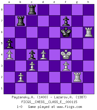 Last move : 1-0 2010 June 27 9:7:6 [Event "FICGS__CHESS__CLASS_E__000115"] [Site "FICGS"] [Date "2009.11.08"] [Round "1"] [White "Payzansky,Aleksey"] [Black "Lazarov,Alexander"] [Result "1-0"] [WhiteElo "1400"] [BlackElo "1387"] 1.e4 e5 2.Nf3 Nc6 3.Bb5 a6 4.Ba4 Nf6 5.O-O Be7 6.Re1 b5 7.Bb3 O-O 8.c3 d5 9.exd5 Nxd5 10.Nxe5 Nxe5 11.Rxe5 c6 12.d3 Bd6 13.Re1 Qh4 14.g3 Qh3 15.Re4 Qf5 16.Nd2 Nf6 17.Re1 Qh3 18.Qf3 Bg4 19.Qg2 Qh5 20.Qxc6 Bc5 21.d4 Rfc8 22.Qb7 Bd6 23.f3 Bh3 24.Ne4 Nxe4 25.Qxe4 Bf5 26.Qd5 Qg6 27.g4 Bd3 28.h4 h5 29.Bg5 Bf8 30.Kf2 Bc4 31.Bxc4 bxc4 32.Re2 a5 33.a4 Ra6 34.Rae1 Rb6 35.Kg3 hxg4 36.Kxg4 R6b8 37.h5 Qd6 38.Qxd6 Bxd6 39.h6 gxh6 40.Bxh6 Kh7 41.Rh1 Kg6 42.Bf4 Bxf4 43.Kxf4 Rb7 44.Rg2+ Kf6 45.Rh6+ 1-0 This chess game has been lost on time (started : 2009.11.08 11:40:58) Ruy Lopez : Closed, 7...O-O Kingside Castling by player White (move 5) Kingside Castling by player Black (move 7) Player White won this chess game. Follow this game move after move (download)I'm not afraid of Spassky. The world knows I'm the best. You don't need a match to prove it. (Bobby Fischer) Ohne Fehler kann es keine Brillanz geben. (Emanuel Lasker) El muchacho (en ese entonces un niño de 12 años llamado Anatoly Karpov) no tiene ni idea de lo que es el Ajedrez y no hay futuro en absoluto para el en esta profesión. (Mikhail Botvinnik) Une platitude souvent récitée à propos des Echecs est qu'une des choses les plus difficiles à réaliser est de gagner une position gagnante. Cela ne manque pas de sens mais, pour ma part, j'ai toujours trouvé plus difficile de gagner une position perdante. (Tim Krabbe) Luck never made a man wise. (Seneca, Letters to Lucilius)