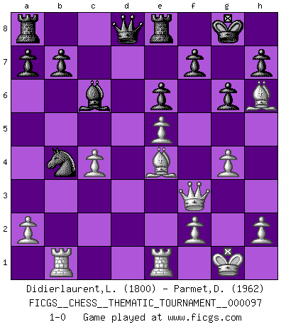 Last move : 1-0 2009 December 16 19:43:26 [Event "FICGS__CHESS__THEMATIC_TOURNAMENT__000097"] [Site "FICGS"] [Date "2009.11.08"] [Round "1"] [White "Didierlaurent,Ludovic"] [Black "Parmet,Daniel"] [Result "1-0"] [WhiteElo "1800"] [BlackElo "1962"] 1.e4 c6 2.d4 d5 3.exd5 cxd5 4.c4 Nf6 5.Nc3 e6 6.Nf3 Be7 7.cxd5 Nxd5 8.Bd3 Nc6 9.O-O O-O 10.Re1 Bf6 11.Be4 Nce7 12.Qd3 g6 13.Bh6 Re8 14.Ne5 Bd7 15.Qf3 Bc6 16.g4 Bxe5 17.dxe5 Nxc3 18.bxc3 Nd5 19.c4 Nb4 20.Rab1 1-0 Caro-Kann : Panov-Botvinnik attack, 5...e6 Kingside Castling by player White (move 9) Kingside Castling by player Black (move 9) Player White won this chess game. Follow this game move after move (download)It was clear to me that the vulnerable point of the American Grandmaster (Bobby Fischer) was in double-edged, hanging, irrational positions, where he often failed to find a win even in a won position. (Efim Geller) Es macht mich traurig, wenn ich sehe, dass Golfprofis mehr verdienen als Schachsportler. Obwohl ich davon überzeugt bin, dass wir Schachspieler viel härter trainieren müssen als die Golfer. (Alexandra Kosteniuk) Tu eres para mi la Reina en d8 y yo soy el Peón en d7!!. (GM Eduard Gufeld) Ce qui est bien, c'est d'avoir tout un tas de pièces en prise : l'adversaire ne peut en prendre qu'une à la fois. Cité par Thierry Audin. Methinks King Thibault should dub Marius Zubac a knight of the square board... I mean table, henceforth addressing him as Sir Marius, and bestow on him a suitable land from the kingdom of FICGS & marry him off to a worthy, fair maiden, lest he slice our heads with his mighty sword in his wrath. (Dinesh De Silva)