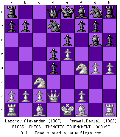 Last move : 0-1 2010 January 7 8:30:53 [Event "FICGS__CHESS__THEMATIC_TOURNAMENT__000097"] [Site "FICGS"] [Date "2009.11.08"] [Round "1"] [White "Lazarov,Alexander"] [Black "Parmet,Daniel"] [Result "0-1"] [WhiteElo "1387"] [BlackElo "1962"] 1.e4 c6 2.d4 d5 3.e5 Bf5 4.Nc3 e6 5.g4 Bg6 6.Nge2 Nd7 7.Qd2 c5 8.h4 h6 9.Nf4 cxd4 0-1 This chess game has been lost on time (started : 2009.11.08 12:1:23) Caro-Kann : Advance variation Player Black won this chess game. Follow this game move after move (download)A big shock; the best chess player in history has passed away. (Lajos Portisch, about Bobby Fischer's death) In Buenos Aires ist es nicht mein vorrangiges Ziel ein starkes Turnier zu organisieren, sondern ein Turnier für Gentlemen. Ich würde nie Kamsky einladen. Ich mag keine Probleme. (Miguel Najdorf) El tablero es el mundo, las piezas es el fenomeno del universo, las reglas del juego son lo que llamamos leyes de la naturaleza y el jugador del lado opuesto, se encuentra oculto a nuestra vista. (Thomas Huxley) J'ai toujours senti une vague pitié pour l'homme qui ne connaît rien aux échecs, tout comme j'en aurais pour un homme ignorant de l'amour. Les Echecs, comme la musique ou comme l'amour, ont le pouvoir de rendre heureux. (Siegbert Tarrasch) Life is painting a picture, not doing a sum. (Oliver Wendell Holmes, Jr.)