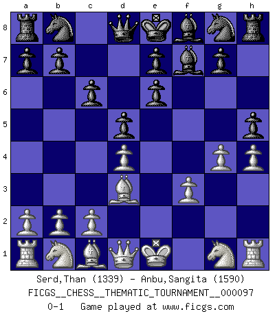 Last move : 0-1 2009 December 27 20:7:7 [Event "FICGS__CHESS__THEMATIC_TOURNAMENT__000097"] [Site "FICGS"] [Date "2009.11.08"] [Round "1"] [White "Serd,Than"] [Black "Anbu,Sangita"] [Result "0-1"] [WhiteElo "1339"] [BlackElo "1590"] 1.e4 c6 2.d4 d5 3.e5 Bf5 4.g4 Be4 5.f3 Bg6 6.h4 h5 7.e6 fxe6 8.Bd3 Bf7 0-1 This chess game has been lost on time (started : 2009.11.08 12:1:23) Caro-Kann : Advance variation Player Black won this chess game. Follow this game move after move (download)I have always a slight feeling of pity for the man who has no knowledge of Chess. (Siegbert Tarrasch) Herr Iljumschinow ist ein etwas merkwürdiger Geschäftsmann: Er arbeitet zusammen mit Leuten wie Muammar al-Gaddafi; früher ist das Saddam Hussein gewesen. (Joel Lautier) Un juego de Ajedrez es un dialogo, una conversación entre un jugador y su oponente. Cada movimiento del oponente puede contener amenazas o tropiezos, pero un jugador no se puede defender de las amenazas o tomar ventaja de los tropiezos si es que no se pregunta a sí mismo: ¿Que es lo que mi oponente va a hacer después de cada movida?. (Bruce A. Moon) Je ne crois pas en la psychologie, je crois aux bons coups. (Robert Fischer) If you don't practice you don't deserve to win. (Andre Agassi)
