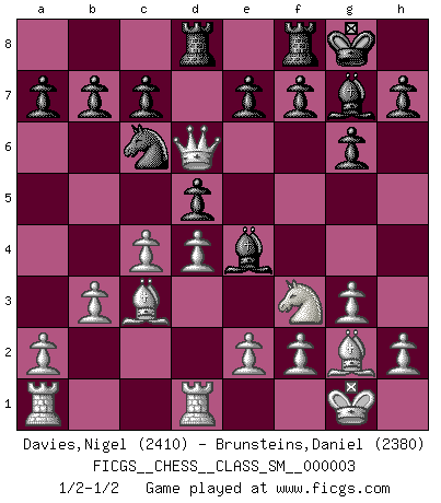 Last move : 1/2-1/2 2006 November 14 20:10:55 [Event "FICGS__CHESS__CLASS_SM__000003"] [Site "FICGS"] [Date "2006.10.03"] [Round "1"] [White "Davies,Nigel"] [Black "Brunsteins,Daniel"] [Result "1/2-1/2"] [WhiteElo "2410"] [BlackElo "2380"] 1.d4 Nf6 2.Nf3 g6 3.c4 Bg7 4.g3 d6 5.Bg2 O-O 6.O-O Nc6 7.Nc3 Bf5 8.b3 Ne4 9.Bb2 Nxc3 10.Bxc3 Be4 11.Qd2 d5 12.Rfd1 Qd6 13.Qf4 Rad8 14.Qxd6 1/2-1/2 King's Indian : East Indian defense Kingside Castling by player Black (move 5) Kingside Castling by player White (move 6) This chess game ended in a draw. Follow this game move after move (download)Pawns are born free, yet they are everywhere in chains. (Rick Kennedy) Jeder leidlich begabte Spieler, er braucht keineswegs hervorragend veranlagt zu sein, kann es zum Meister bringen. Aber das ist ja auch gar nicht nötig! Der richtige Standpunkt ist es, zu seinem Vergnügen zu spielen, und man glaube ja nicht, dass der Genuss proportional dem Können sei. (Siegbert Tarrasch) Una mala movida nulifica cuarenta buenas. (Horowitz) Les échecs, c'est l'imagination. (David Bronstein) Internal peace cannot coexist with external war. (Don Groves)