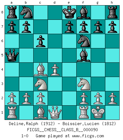 Last move : 1-0 2009 December 21 15:16:35 [Event "FICGS__CHESS__CLASS_B__000090"] [Site "FICGS"] [Date "2009.11.09"] [Round "1"] [White "Deline,Ralph"] [Black "Boissier,Lucien"] [Result "1-0"] [WhiteElo "1912"] [BlackElo "1812"] 1.e4 d5 2.exd5 Qxd5 3.Nc3 Qa5 4.d4 c6 5.Nf3 Bf5 6.Bc4 Nf6 7.O-O 1-0 This chess game has been lost on time (started : 2009.11.09 16:2:57) Scandinavian (centre counter) defense Kingside Castling by player White (move 7) Player White won this chess game. Follow this game move after move (download)Spassky will not be psyched out by Fischer. (Mike Goodall) Wenn ich Weiß habe gewinne ich weil ich Weiß habe, wenn ich Schwarz habe gewinne ich weil ich Bogoljubov bin. (Efim Bogoljubov) Yo no le temo a Spassky. Todos saben que yo soy el mejor. Uno no necesita un torneo para probarlo. (Bobby Fischer) J'ai toujours senti une vague pitié pour l'homme qui ne connaît rien aux échecs, tout comme j'en aurais pour un homme ignorant de l'amour. Les Echecs, comme la musique ou comme l'amour, ont le pouvoir de rendre heureux. (Siegbert Tarrasch) Memory is a way of holding onto the things you love, the things you are, the things you never want to lose. (from the television show: The Wonder Years)
