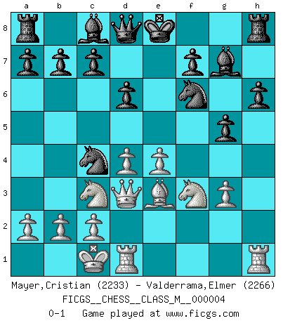 Last move : 0-1 2006 September 16 13:23:48 [Event "FICGS__CHESS__CLASS_M__000004"] [Site "FICGS"] [Date "2006.04.23"] [Round "1"] [White "Mayer,Cristian"] [Black "Valderrama,Elmer"] [Result "0-1"] [WhiteElo "2233"] [BlackElo "2266"] 1.e4 e5 2.f4 exf4 3.Nf3 h6 4.d4 g5 5.Nc3 d6 6.g3 fxg3 7.hxg3 Bg7 8.Bc4 Nf6 9.Qd3 Nc6 10.Be3 Na5 11.O-O-O Nxc4 0-1 Comment by player 2 : Elmer Valderrama : How should the King's gambit be dealt with? It's clear that it (should) give nothing to White, and there are a dozen lines to prove it, but when I was facing the first moves in this game --and having seen what was played in other games here on ficgs-- I decided to pay respect to Leko's choice in the game versus Morozevich (Frankfurt, 2000) which finished in a draw (of course I had an improvement for Black ;) Now, White deviated with 10.Be3 from that game(10.Bb3),and we are now following Grischuk-Lunev, Moscow 1999 --> 1-0 by the way, now I hope I will do better than Lunev here ;) 0-1 by forfeit. ..too bad I couldn't test 12...Nxe4!? (after the expected 12.Qxc4) (The mentioned above game Grischuk-Lunev went 12...c6!? 13.d5 with initiative, White eventually got a winning position) KGA : Becker defense Queenside Castling by player White (move 11) Player Black won this chess game. Follow this game move after move (download)One bad move nullifies forty good ones. (Horowitz) Nicht daß Diemer aus Opportunismus Mitglied der NSDAP geworden wäre. Er war ein Fanatiker, in allem, was er tat. (Hans Ree) La esencia del Ajedrez es pensar acerca de lo que el Ajedrez es. (David Bronstein) La tactique, c'est ce que vous faites quand il y a quelque chose à faire; la stratégie, c'est ce que vous faites quand il n'y a rien à faire. (Savielli Tartacower) Games, world of games... There's always an opponent, and there's always a victim. (Revolver, movie)