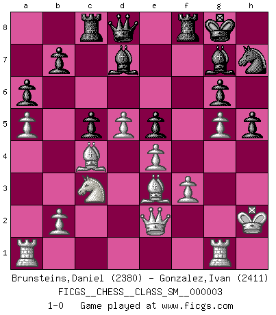 Last move : 1-0 2007 April 9 10:33:49 [Event "FICGS__CHESS__CLASS_SM__000003"] [Site "FICGS"] [Date "2006.10.03"] [Round "1"] [White "Brunsteins,Daniel"] [Black "Gonzalez,Ivan"] [Result "1-0"] [WhiteElo "2380"] [BlackElo "2411"] 1.d4 e6 2.Nf3 Nf6 3.c4 c5 4.d5 exd5 5.cxd5 d6 6.Nc3 g6 7.h3 Bg7 8.e4 O-O 9.Bd3 Nh5 10.O-O a6 11.a4 Nd7 12.Re1 Re8 13.g4 Nhf6 14.Bf4 h5 15.g5 Nh7 16.h4 Ne5 17.Nxe5 dxe5 18.Be3 Bg4 19.f3 Bh3 20.Kh2 Bd7 21.a5 f6 22.Rg1 fxg5 23.hxg5 Rf8 24.Qe2 Rc8 25.Bc4 1-0 This chess game has been lost on time (started : 2006.10.03 6:6:10) Queen's pawn Kingside Castling by player Black (move 8) Kingside Castling by player White (move 10) Player White won this chess game. Follow this game move after move (download)In Chess, as it is played by masters, chance is practically eliminated. (Emanuel Lasker) Er war ein guter Schachspieler, aber ich kann Leute nicht ausstehen, die 'Heil Hitler' rufen (Über Alexander Aljechin). (Miguel Najdorf) No hay un Gran Maestro de Ajedrez que sea normal; solo se diferencían ellos por la magnitud de su locura. (Viktor Korchnoi) Comme les marins qui ont mille raisons différentes d'aller en mer, les joueurs d'échecs en ont tout autant avant de s'installer devant une table et jouer... (Vincent Bertignac, philosophe) I find your interest interesting. (Gregory House, House M.D.)