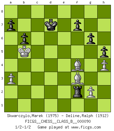 Last move : 1/2-1/2 2010 January 11 8:36:2 [Event "FICGS__CHESS__CLASS_B__000090"] [Site "FICGS"] [Date "2009.11.09"] [Round "1"] [White "Skwarczylo,Marek"] [Black "Deline,Ralph"] [Result "1/2-1/2"] [WhiteElo "1975"] [BlackElo "1912"] 1.d4 Nf6 2.Nf3 g6 3.c4 Bg7 4.Nc3 d5 5.cxd5 Nxd5 6.e4 Nxc3 7.bxc3 c5 8.Be3 Qa5 9.Qd2 O-O 10.Rc1 Bg4 11.Be2 Nd7 12.O-O Bxf3 13.Bxf3 cxd4 14.cxd4 Qxd2 15.Bxd2 Bxd4 16.Rc7 Nc5 17.Rxe7 Rfe8 18.Rxe8+ Rxe8 19.Re1 Nd3 20.Re2 Rd8 21.Bh6 Nxf2 22.Rxf2 Rc8 23.Bd1 Rc4 24.Bb3 Bxf2+ 25.Kxf2 Rxe4 26.Be3 b6 27.Kf3 Rh4 28.h3 Kg7 29.Bf2 Rh5 30.Bd4+ Kf8 31.Ke3 h6 32.Bd1 Rd5 33.Bb3 Rd8 34.Bf6 Rc8 35.h4 Rc1 36.Bd5 Re1+ 37.Kd3 Rd1+ 38.Kc4 Rf1 39.Bf3 Rc1+ 40.Kb4 Rc5 41.Bd4 Rf5 42.Be3 h5 43.a3 Ke7 44.Kc4 Ra5 45.Kb4 Re5 46.Bf4 Rc5 47.Bb8 Kd7 48.Bg3 Rc2 49.Bf4 Rf2 50.Kb5 1/2-1/2 King's Indian : East Indian defense Kingside Castling by player Black (move 9) Kingside Castling by player White (move 12) This chess game ended in a draw. Follow this game move after move (download)The boy (then a 12 year old boy named Anatoly Karpov) doesn't have a clue about Chess, and there's no future at all for him in this profession. (Mikhail Botvinnik) Ihnen, Herr Lasker, habe ich nur drei Worte zu sagen: Schach und matt. (Siegbert Tarrasch) Hay jugadores fuertes y personas amables y yo soy un jugador fuerte. (Bobby Fischer) Votre prénom est 'Tactique', votre deuxième prénom est 'Tactique' et votre nom est 'Tactique'. (Ken Smith) Internet: Absolute communication, absolute isolation. (Paul Carvel)
