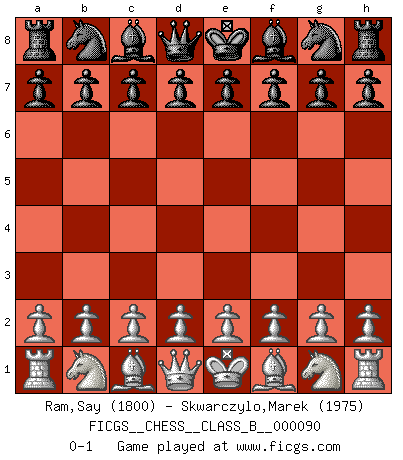 Last move : 0-1 2009 December 19 19:53:56 [Event "FICGS__CHESS__CLASS_B__000090"] [Site "FICGS"] [Date "2009.11.09"] [Round "1"] [White "Ram,Say"] [Black "Skwarczylo,Marek"] [Result "0-1"] [WhiteElo "1800"] [BlackElo "1975"] 0-1 This chess game has been lost on time (started : 2009.11.09 16:2:57) Player Black won this chess game. Follow this game move after move (download)If I win a tournament, I win it by myself. I do the playing. Nobody helps me. (Bobby Fischer) Ich würde die 30 stärksten Spieler der USA im Simultanspiel besiegen. (José Raúl Capablanca) Los libros de Ajedrez deben de usarse igual como usamos los anteojos: para mejorar la vista, aunque algunos jugadores los quieren usar como si ellos les otorgaran la vision. (José Raúl Capablanca) A ce moment-là, je menaçais de comprendre la position ! (Clément L'Heureux) I live to kill Traxler counterattack. (Ilmars Cirulis)