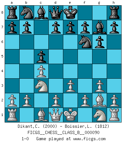 Last move : 1-0 2009 December 20 7:54:4 [Event "FICGS__CHESS__CLASS_B__000090"] [Site "FICGS"] [Date "2009.11.09"] [Round "1"] [White "Dikant,Christophe"] [Black "Boissier,Lucien"] [Result "1-0"] [WhiteElo "2000"] [BlackElo "1812"] 1.c4 Nf6 2.Nc3 c5 3.g3 g6 4.Bg2 Bg7 5.e3 1-0 This chess game has been lost on time (started : 2009.11.09 16:2:57) English Opening Player White won this chess game. Follow this game move after move (download)When you are lonely, when you feel yourself an alien in the world, play Chess. This will raise your spirits and be your counselor in war. (Aristotle) Schach ist wie eine schöne Frau, zu der wir ständig zurückkehren, gleichviel, wie oft sie uns zurückweist. (Anonymous) Bobby solo arroja las piezas y solas caen en las casillas correctas. (Miguel Najdorf ) Mais n'est-ce pas déjà le limiter injurieusement que d'appeler les échecs un jeu? N'est-ce pas aussi une science, un art, ou quelque chose qui, comme le cercueil de Mahomet entre ciel et terre, est suspendu entre l'un et l'autre, et qui réunit un nombre incroyable de contraires ? (Stefan Zweig) Don't be irreplaceable, if you can't be replaced, you can't be promoted. (Dan Rotaru)