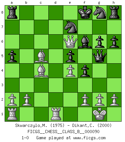 Last move : 1-0 2009 November 22 12:45:37 [Event "FICGS__CHESS__CLASS_B__000090"] [Site "FICGS"] [Date "2009.11.09"] [Round "1"] [White "Skwarczylo,Marek"] [Black "Dikant,Christophe"] [Result "1-0"] [WhiteElo "1975"] [BlackElo "2000"] 1.d4 g6 2.e4 Bg7 3.c4 d6 4.Nc3 Nc6 5.Nf3 e5 6.d5 Nce7 7.Be2 f5 8.Ng5 h6 9.Ne6 Bxe6 10.dxe6 Qc8 11.c5 dxc5 12.Be3 c6 13.Bxc5 Qxe6 14.Qa4 f4 15.O-O b5 16.Qa6 Qc8 17.Qa5 Qd8 18.Qa3 a5 19.Rfd1 Qb8 20.Bd6 Qc8 21.Qc5 Qe6 22.Nxb5 cxb5 23.Qxb5+ Kf8 24.Bc4 Qf6 25.Bc5 Qg5 26.Qb6 Bf6 27.Qe6 1-0 Modern defense Kingside Castling by player White (move 15) Player White won this chess game. Follow this game move after move (download)That's what Chess is all about. One day you give your opponent a lesson, the next day he gives you one. (Bobby Fischer) Moralische Siege zählen nicht. (Savielly Grigorievitsch Tartakower) Solo el jugador con la iniciativa tiene el derecho a atacar. (Wilhelm Steinitz) Nous vivons dans un monde échiquéen : chaque jour qui passe est un défi à relever. (Philosophe Sasha) Difficult things take a long time, impossible things a little longer. (Author unknown)