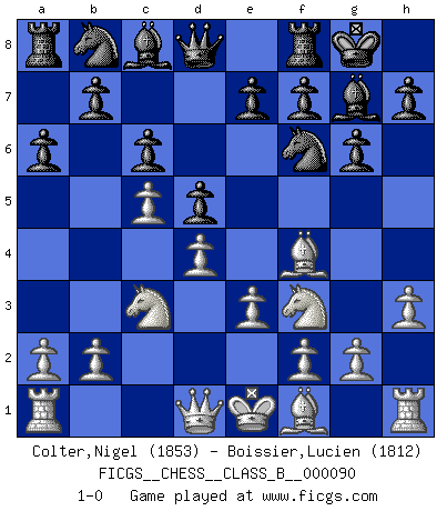 Last move : 1-0 2010 January 29 8:40:14 [Event "FICGS__CHESS__CLASS_B__000090"] [Site "FICGS"] [Date "2009.11.09"] [Round "1"] [White "Colter,Nigel"] [Black "Boissier,Lucien"] [Result "1-0"] [WhiteElo "1853"] [BlackElo "1812"] 1.d4 d5 2.Nf3 c6 3.c4 Nf6 4.Nc3 a6 5.c5 g6 6.Bf4 Bg7 7.h3 O-O 8.e3 1-0 This chess game has been lost on time (started : 2009.11.09 16:2:57) Queen's pawn game Kingside Castling by player Black (move 7) Player White won this chess game. Follow this game move after move (download)I'm not afraid of Spassky. The world knows I'm the best. You don't need a match to prove it. (Bobby Fischer) Ohne Fehler kann es keine Brillanz geben. (Emanuel Lasker) Aunque la mayoría de la gente disfruta observar las partidas de los grandes Maestros de ataque, algunos de los jugadores mas notables en la historia han sido los jugadores silenciosos posicionales. Lentamente ellos te aplastan despojandote de tu espacio, congestionando tus piezas y dejandote virtualmente sin nada que hacer. (Yasser Seirawan) Les réformistes prétendent que les progrès de la théorie conduiront à la disparition des échecs, et qu'il faut, pour leur rendre vie, en remanier les règles. En réalité, qu'exprime cette affirmation? Le mépris de l'intuition, de l'imagination et de tous les autres éléments qui font des échecs un art. (Alexander Alekhine) Nowadays, anyone who cannot speak English and is incapable of using the Internet is regarded as backward. (Al-Waleed bin Talal)