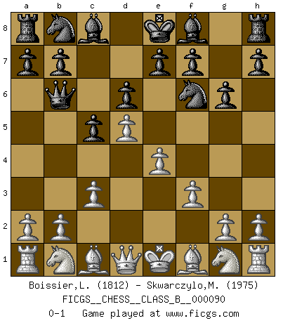 Last move : 0-1 2010 January 6 8:30:8 [Event "FICGS__CHESS__CLASS_B__000090"] [Site "FICGS"] [Date "2009.11.09"] [Round "1"] [White "Boissier,Lucien"] [Black "Skwarczylo,Marek"] [Result "0-1"] [WhiteElo "1812"] [BlackElo "1975"] 1.d4 Nf6 2.Bg5 Ne4 3.Bf4 c5 4.f3 Qa5+ 5.c3 Nf6 6.d5 Qb6 7.Bc1 d6 8.e4 g6 0-1 This chess game has been lost on time (started : 2009.11.09 16:2:57) Trompowsky attack (Ruth, Opovcensky Opening) Player Black won this chess game. Follow this game move after move (download)Don't even mention losing to me. I can't stand to think of it. (Bobby Fischer) Wenn ich mich einlogge, glauben die Leute gewöhnlich nicht, dass ich es selbst bin und sie fangen an, mir dumme Fragen zu stellen. Und wenn sie es glauben, stellen sie wieder andere dumme Fragen. (Judith Polgar) Si el ingenio solamente fuese necesario para lucirse, las mujeres serían las mejores jugadoras de Ajedrez del mundo. (Albin) Seul un grand joueur sait à quel point il joue faiblement. (Xavier Tartacover) Two beer, or not two beer. (Unknown)