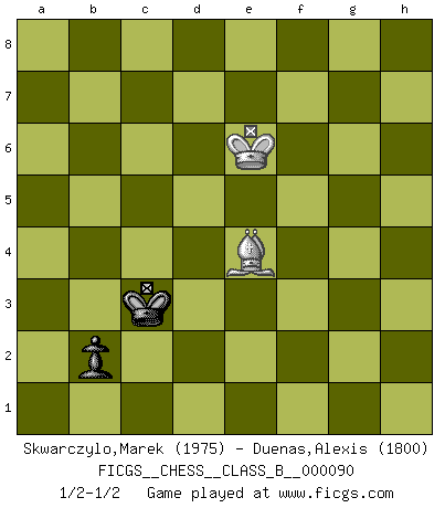 Last move : 1/2-1/2 2010 March 22 2:27:17 [Event "FICGS__CHESS__CLASS_B__000090"] [Site "FICGS"] [Date "2009.11.09"] [Round "1"] [White "Skwarczylo,Marek"] [Black "Duenas,Alexis"] [Result "1/2-1/2"] [WhiteElo "1975"] [BlackElo "1800"] 1.d4 e6 2.c4 d5 3.Nf3 c6 4.e3 Nf6 5.Nc3 Nbd7 6.Bd3 dxc4 7.Bxc4 b5 8.Bd3 a6 9.e4 c5 10.d5 Bb7 11.dxe6 fxe6 12.Bc2 c4 13.O-O Qc7 14.Ng5 Nc5 15.Qf3 Bd6 16.Qh3 O-O-O 17.b4 cxb3 18.Bxb3 Be5 19.Be3 Rd3 20.Nd5 Nxd5 21.Nxe6 Nxe6 22.Qxe6+ Kb8 23.exd5 Bc8 24.Bb6 Bxh2+ 25.Kh1 Qd6 26.Qxd6+ Bxd6 27.Rfe1 Kb7 28.Rac1 Bd7 29.Be3 Bb4 30.Red1 Rxd1+ 31.Bxd1 Rc8 32.Rxc8 Kxc8 33.Bc2 g6 34.Bf4 a5 35.Kh2 Kb7 36.Kg3 Kb6 37.Be3+ Kc7 38.Kh4 Be7+ 39.Kg3 b4 40.Kf4 Kd6 41.Bb3 a4 42.Bc4 Bf6 43.g4 h5 44.gxh5 gxh5 45.Ke4 h4 46.Bd2 Kc5 47.Bd3 b3 48.axb3 axb3 49.Be3+ Kb4 50.Bd2+ Bc3 51.Bg5 h3 52.Be7+ Ka4 53.Bd6 b2 54.Bc2+ Ka5 55.Kf3 Ba4 56.Bb1 Bd1+ 57.Kg3 Ka4 58.Ba2 Bb3 59.Bb1 Bxd5 60.Kxh3 Bb3 61.f4 Bd1 62.Be4 Bd4 63.Be5 Bxe5 64.fxe5 Bb3 65.Kg4 Kb4 66.Kf5 Kc3 67.e6 Bxe6+ 68.Kxe6 1/2-1/2 Queen's pawn Kingside Castling by player White (move 13) Queenside Castling by player Black (move 16) 10 pieces endgame at move 48 : White KBBPP , Black KBBPP WHITE : King + 2 Bishops 2 Pawns BLACK : King + 2 Bishops 2 Pawns 9 pieces endgame at move 59 : White KBBP , Black KBBPP WHITE : King + 2 Bishops 1 Pawn BLACK : King + 2 Bishops 2 Pawns 8 pieces endgame at move 60 : White KBBP , Black KBBP WHITE : King + 2 Bishops 1 Pawn BLACK : King + 2 Bishops 1 Pawn 7 pieces endgame at move 63 : White KBP , Black KBBP WHITE : King + 1 Bishop 1 Pawn BLACK : King + 2 Bishops 1 Pawn 6 pieces endgame at move 64 : White KBP , Black KBP WHITE : King + 1 Bishop 1 Pawn BLACK : King + 1 Bishop 1 Pawn 5 pieces endgame at move 67 : White KB , Black KBP WHITE : King + 1 Bishop BLACK : King + 1 Bishop 1 Pawn 4 pieces endgame at move 68 : White KB , Black KP WHITE : King + 1 Bishop BLACK : King + 1 Pawn This chess game ended in a draw. Follow this game move after move (download)I have always a slight feeling of pity for the man who has no knowledge of Chess. (Siegbert Tarrasch) Obwohl ich vom Stil her kaum zu den Priestern der Schachkunst gezählt werde, halte ich Schach doch für eine Kunst. (Tigran Petrosjan) Cuando la partida de Ajedrez termina, el Peón y el Rey regresan a la misma caja. (Irish saying) L'ordinateur a tué l'originalité. Il n'y a plus guère d'aventures sur l'échiquier. (Jacob Murray) Strategy without tactics is the slowest route to victory. Tactics without strategy is the noise before defeat. (Sun Tzu)