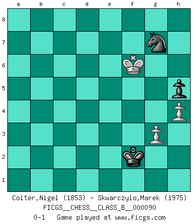 Last move : 0-1 2010 September 12 21:11:7 [Event "FICGS__CHESS__CLASS_B__000090"] [Site "FICGS"] [Date "2009.11.09"] [Round "1"] [White "Colter,Nigel"] [Black "Skwarczylo,Marek"] [Result "0-1"] [WhiteElo "1853"] [BlackElo "1975"] 1.d4 Nf6 2.Nf3 g6 3.Bf4 Bg7 4.e3 O-O 5.Be2 c5 6.c3 b6 7.O-O d6 8.h3 Bb7 9.Nbd2 Nbd7 10.a4 Re8 11.Bh2 h6 12.Bc4 e5 13.dxe5 dxe5 14.Nh4 Nf8 15.a5 N6d7 16.Bg3 Bc6 17.Qb3 Qe7 18.Bd5 Bxd5 19.Qxd5 Rad8 20.Rfd1 e4 21.Nc4 Ne5 22.Qxe4 f5 23.Nxg6 Nfxg6 24.Qxf5 Rxd1+ 25.Rxd1 Nxc4 26.Qxg6 Nxa5 27.b4 cxb4 28.cxb4 Nc4 29.Rd4 b5 30.Rd5 Qe6 31.Qxe6+ Rxe6 32.Rxb5 Rb6 33.Rxb6 axb6 34.b5 Bf8 35.e4 Bc5 36.Bf4 Kh7 37.Kf1 Na3 38.Ke2 Nxb5 39.e5 Kg6 40.Bc1 Nd4+ 41.Kd3 Nb3 42.Be3 h5 43.Bxc5 Nxc5+ 44.Kc4 Ne6 45.h4 Nf4 46.g3 Ne2 47.Kd3 Ng1 48.Kd4 Kf5 49.Kd5 Nf3 50.e6 Kf6 51.Kd6 Nd4 52.e7 Nf5+ 53.Kc6 Kxe7 54.Kxb6 Kd6 55.Kb7 Ke5 56.Kc7 Ke4 57.Kd7 Kf3 58.Ke6 Ng7+ 59.Kf6 Kxf2 0-1 King's Indian : London system Kingside Castling by player Black (move 4) Kingside Castling by player White (move 7) 10 pieces endgame at move 43 : White KBPPPP , Black KNPP WHITE : King + 1 Bishop 4 Pawns BLACK : King + 1 Knight 2 Pawns 9 pieces endgame at move 43 : White KPPPP , Black KNPP WHITE : King + 4 Pawns BLACK : King + 1 Knight 2 Pawns 8 pieces endgame at move 53 : White KPPP , Black KNPP WHITE : King + 3 Pawns BLACK : King + 1 Knight 2 Pawns 7 pieces endgame at move 54 : White KPPP , Black KNP WHITE : King + 3 Pawns BLACK : King + 1 Knight 1 Pawn 6 pieces endgame at move 59 : White KPP , Black KNP WHITE : King + 2 Pawns BLACK : King + 1 Knight 1 Pawn Player Black won this chess game. Follow this game move after move (download)A sacrifice is best refuted by accepting it. (Wilhelm Steinitz) Ich kenne keine einzige Person, die behaupten würde, Garri Kasparow sei ein guter Mensch (Nigel Short) Prefiero perder una partida realmente buena, que ganar una mala. (David Levy) Le temps de noter son nom sur la feuille de partie, j'étais déjà en zeitnot ! D'un modeste amateur apparié lors de la première ronde d'un open contre le grand-maître Azmaïparashvili. Establishing goals is all right if you don't let them deprive you of interesting detours. (Doug Larson)