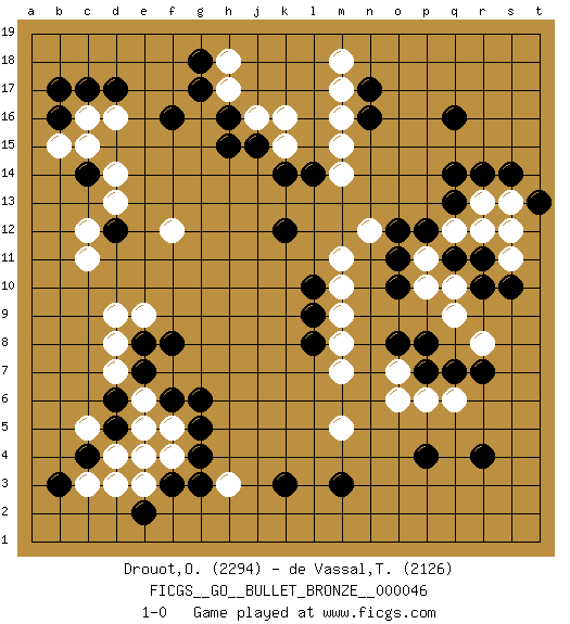 Last move : 1-0 2009 November 10 19:41:19 [Event "FICGS__GO__BULLET_BRONZE__000046"] [Site "FICGS"] [Date "2009.11.10"] [Round "1"] [Black "Drouot,Olivier"] [White "de Vassal,Thibault"] [Result "1-0"] [Rating 1 "2294"] [Rating 2 "2126"] 1.q16 d16 2.p4 d4 3.f3 h3 4.d6 f4 5.g4 f5 6.g3 e3 7.k3 d9 8.e8 e9 9.f8 k16 10.g5 e6 11.g6 d8 12.e7 d7 13.d5 e4 14.c4 c3 15.f6 e5 16.e2 d3 17.b3 c5 18.c14 c12 19.d12 c11 20.f16 d14 21.c17 c16 22.d17 d13 23.b16 b15 24.b17 c15 25.n17 q10 26.r4 m5 27.m3 m7 28.o8 m9 29.o10 m11 30.o12 q12 31.q14 r13 32.r14 r8 33.j15 k15 34.k14 j16 35.h15 m15 36.l14 m17 37.n16 m16 38.h16 h17 39.g17 h18 40.g18 m18 41.r11 r12 42.l10 m10 43.k12 f12 44.l8 m8 45.l9 o6 46.p7 o7 47.p8 n12 48.p12 p11 49.o11 m14 50.r10 q9 51.q11 p10 52.q13 s13 53.s14 s11 54.t13 s12 55.s10 p6 56.q7 q6 57.r7 1-0 Here are the names of the openings (joseki) played in the four corners : Corner d4 : d4 f3 Hoshi (Hwajeom, Seongjeom, Xingwei`) 4-4 Point. The star or hoshi (4-4) point, emphasizing influence at the potential expense of territory. Ikken Kakari (Hankan Keolch'im, Yi Gua`jiao~, 1-Space Low Approach). Black 2 is the standard approach move to the 4-4. Corner d16 : d16 c14 Hoshi (Hwajeom, Seongjeom, Xingwei`) 4-4 Point. The star or hoshi (4-4) point, emphasizing influence at the potential expense of territory. Ikken Kakari (Hankan Keolch'im, Yi Gua`jiao~, 1-Space Low Approach). Black 2 is the standard approach move to the 4-4. Player Black won this Go (weiqi, baduk) game. Follow this game move after move (download)Strange things happen at the one-two points. (Anonymous) Memory... is the diary that we all carry with us. (Oscar Wilde, The Importance of Being Earnest)