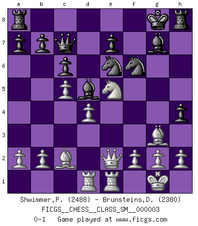 Last move : 0-1 2006 December 19 20:45:59 [Event "FICGS__CHESS__CLASS_SM__000003"] [Site "FICGS"] [Date "2006.10.03"] [Round "1"] [White "Shwimmer,Peter"] [Black "Brunsteins,Daniel"] [Result "0-1"] [WhiteElo "2488"] [BlackElo "2380"] 1.e4 c6 2.d4 d5 3.Nd2 dxe4 4.Nxe4 Nd7 5.Ng5 Qa5+ 6.Bd2 Qd5 7.Bd3 Ngf6 8.N1f3 h6 9.c4 Qd6 10.Nxf7 Kxf7 11.Qe2 g6 12.c5 Qc7 13.O-O Bg7 14.Rfe1 Nf8 15.Ne5+ Kg8 16.Bxg6 Be6 17.Bc2 Bd5 18.Rad1 h5 19.Bf4 Ne6 20.Bg3 h4 0-1 Caro-Kann : 3.Nd2 Kingside Castling by player White (move 13) Player Black won this chess game. Follow this game move after move (download)I am still a victim of Chess. It has all the beauty of art and much more. It cannot be commercialized. Chess is much purer than art in its social position. (Marcel Duchamp) Smyslow ist ein Beweis dafür, dass ich noch zehn Jahre spielen kann! [der 75 jährige über den 85 jährigen] (Viktor Kortschnoi) El Ajedrez es de 30 a 40 por ciento psicología. Uno no cuenta con esto cuando se juega contra una computadora. No lo puedo confundir. (Judith Polgar) Fischer est le meilleur joueur du monde et Karpov n'est qu'un joueur de bistrot. (Garry Kasparov, agé de 16 ans) The worth of a book is to be measured by what you can carry away from it. (James Bryce)