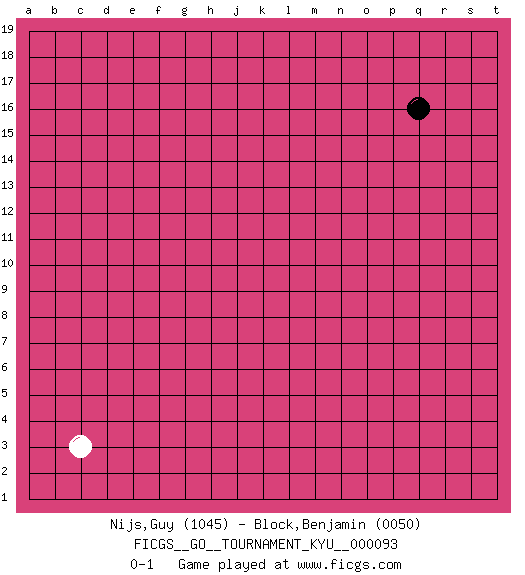 Last move : 0-1 2009 December 27 8:7:1 [Event "FICGS__GO__TOURNAMENT_KYU__000093"] [Site "FICGS"] [Date "2009.11.11"] [Round "1"] [Black "Nijs,Guy"] [White "Block,Benjamin"] [Result "0-1"] [Rating 1 "1045"] [Rating 2 "0050"] 1.q16 c3 0-1 This go game has been lost on time (started : 2009.11.11 4:19:47) Here are the names of the openings (joseki) played in the four corners : Corner d4 : c3 0-1 San-San (Sam-Sam, San-San) 3-3 Point. The San-San (3-3) point, emphasizing territory at the expense of influence. Player White won this Go (weiqi, baduk) game. Follow this game move after move (download)Always remember, keep the balance. [between territory and influence] (Figaro) The only thing that overcomes hard luck is hard work. (Harry Golden)
