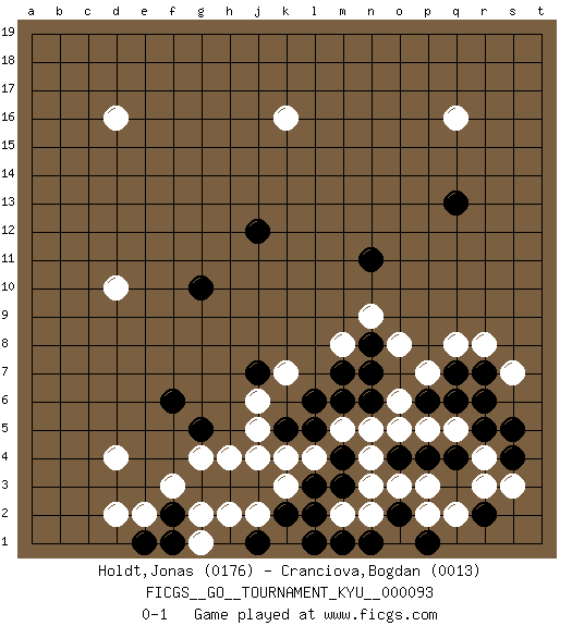 Last move : 0-1 2009 December 11 13:39:21 [Event "FICGS__GO__TOURNAMENT_KYU__000093"] [Site "FICGS"] [Date "2009.11.11"] [Round "1"] [Black "Holdt,Jonas"] [White "Cranciova,Bogdan"] [Result "0-1"] [Rating 1 "0176"] [Rating 2 "0013"] 1.q4 d16 2.g10 q16 3.n11 d4 4.f6 k4 5.q13 k16 6.j12 d10 7.l1 m2 8.m1 n2 9.l2 k3 10.l3 n4 11.m3 n3 12.m4 m5 13.k2 j2 14.n1 p2 15.l5 l4 16.m6 n5 17.o2 p3 18.p1 q2 19.j1 h2 20.h1 g2 21.j3 j4 22.k5 j5 23.h3 g4 24.g5 j6 25.f2 g1 26.g3 k1 27.j1 f3 28.l6 e2 29.e1 d2 30.f1 h4 31.m7 r3 32.p4 r4 33.o4 o3 34.n6 o6 35.j7 q5 36.p6 p7 37.q6 p5 38.r5 o5 39.r6 o8 40.q7 q8 41.s4 s7 42.r7 r8 43.s5 s3 44.r2 k7 45.n7 m8 46.n8 n9 0-1 Here are the names of the openings (joseki) played in the four corners : Corner q16 : q16 n11 Hoshi (Hwajeom, Seongjeom, Xingwei`) 4-4 Point. The star or hoshi (4-4) point, emphasizing influence at the potential expense of territory. Corner d4 : d4 f6 Hoshi (Hwajeom, Seongjeom, Xingwei`) 4-4 Point. The star or hoshi (4-4) point, emphasizing influence at the potential expense of territory. Corner d16 : d16 j12 Hoshi (Hwajeom, Seongjeom, Xingwei`) 4-4 Point. The star or hoshi (4-4) point, emphasizing influence at the potential expense of territory. Player White won this Go (weiqi, baduk) game. Follow this game move after move (download)Balance is not what players strike for, and if it does arise, it is in spite of them. (Pierre Audouard) Computers have lots of memory but no imagination. (Anonymous)