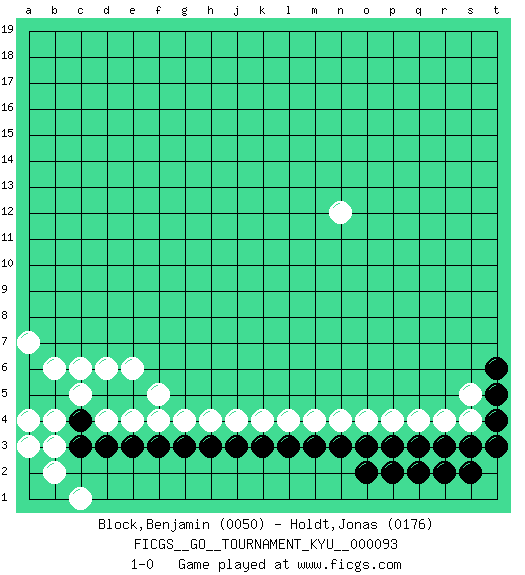 Last move : 1-0 2010 March 27 9:33:44 [Event "FICGS__GO__TOURNAMENT_KYU__000093"] [Site "FICGS"] [Date "2009.11.11"] [Round "1"] [Black "Block,Benjamin"] [White "Holdt,Jonas"] [Result "1-0"] [Rating 1 "0050"] [Rating 2 "0176"] 1.c3 n12 2.r3 r4 3.q3 q4 4.p3 p4 5.o3 o4 6.n3 n4 7.m3 m4 8.l3 l4 9.k3 k4 10.j3 j4 11.h3 h4 12.g3 g4 13.f3 f4 14.e3 e4 15.d3 d4 16.c4 c5 17.b5 b6 18.a5 c6 19.a6 a7 20.s3 s4 21.d5 d6 22.e5 f5 23.s2 e6 24.r2 b2 25.t4 a3 26.t3 c1 27.q2 b3 28.p2 b4 29.o2 a4 30.t5 s5 31.t6 1-0 This go game has been lost on time (started : 2009.11.11 4:19:47) Here are the names of the openings (joseki) played in the four corners : Corner q4 : r3 r4 San-San (Sam-Sam, San-San) 3-3 Point. The San-San (3-3) point, emphasizing territory at the expense of influence. This move is not recommended. White should envisage 4-4, 5-3, 6-4, 5-4 or 6-3 instead. Player Black won this Go (weiqi, baduk) game. Follow this game move after move (download)The monkey jump is worth eight points. (Anonymous) A clear conscience is usually the sign of a bad memory. (Unknown)